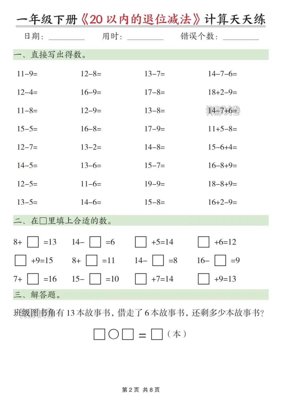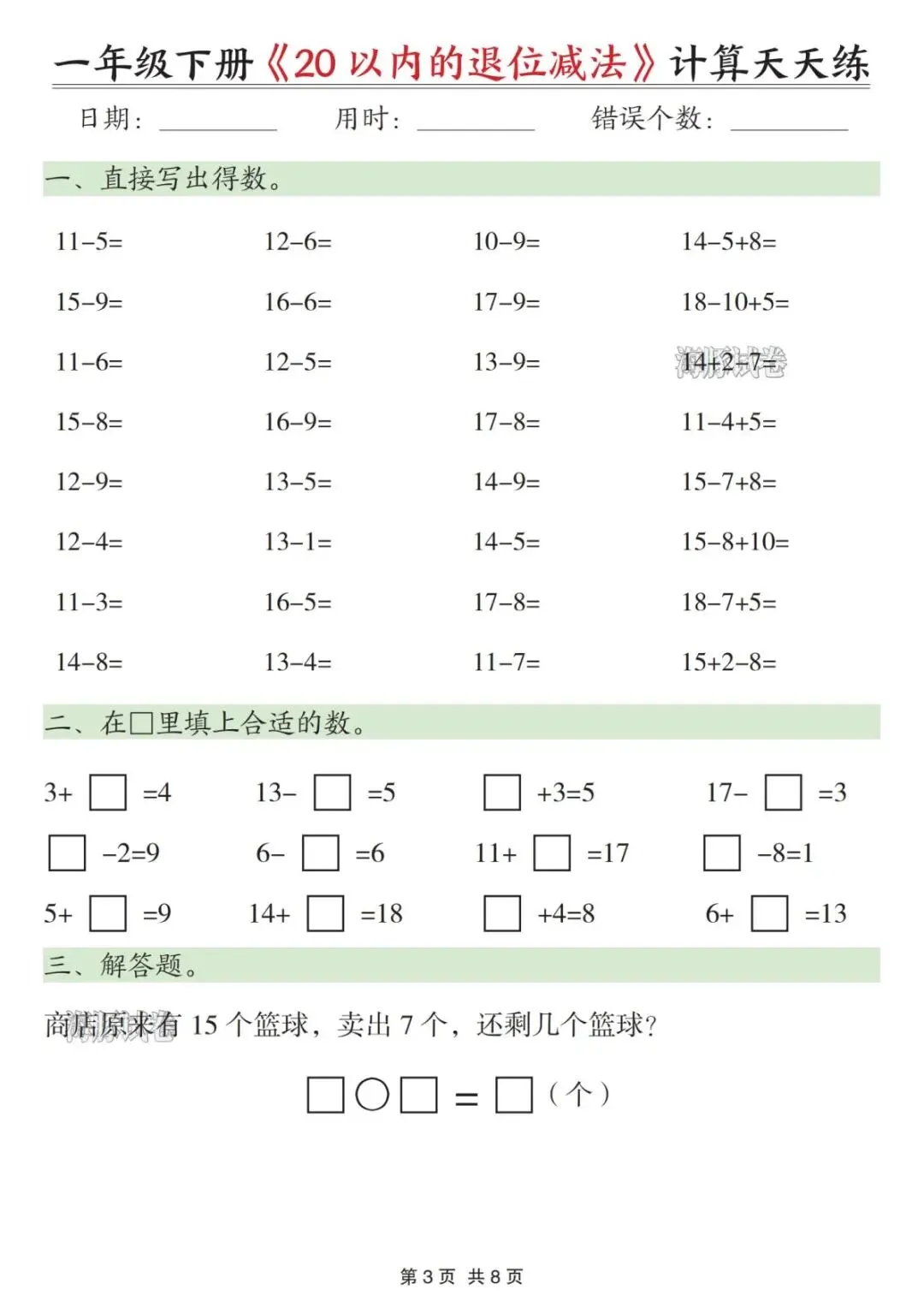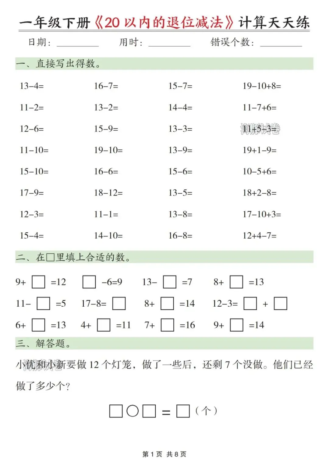 【海豚试卷】一年级(下)数学20以内退位减法天天练(可收藏打印)