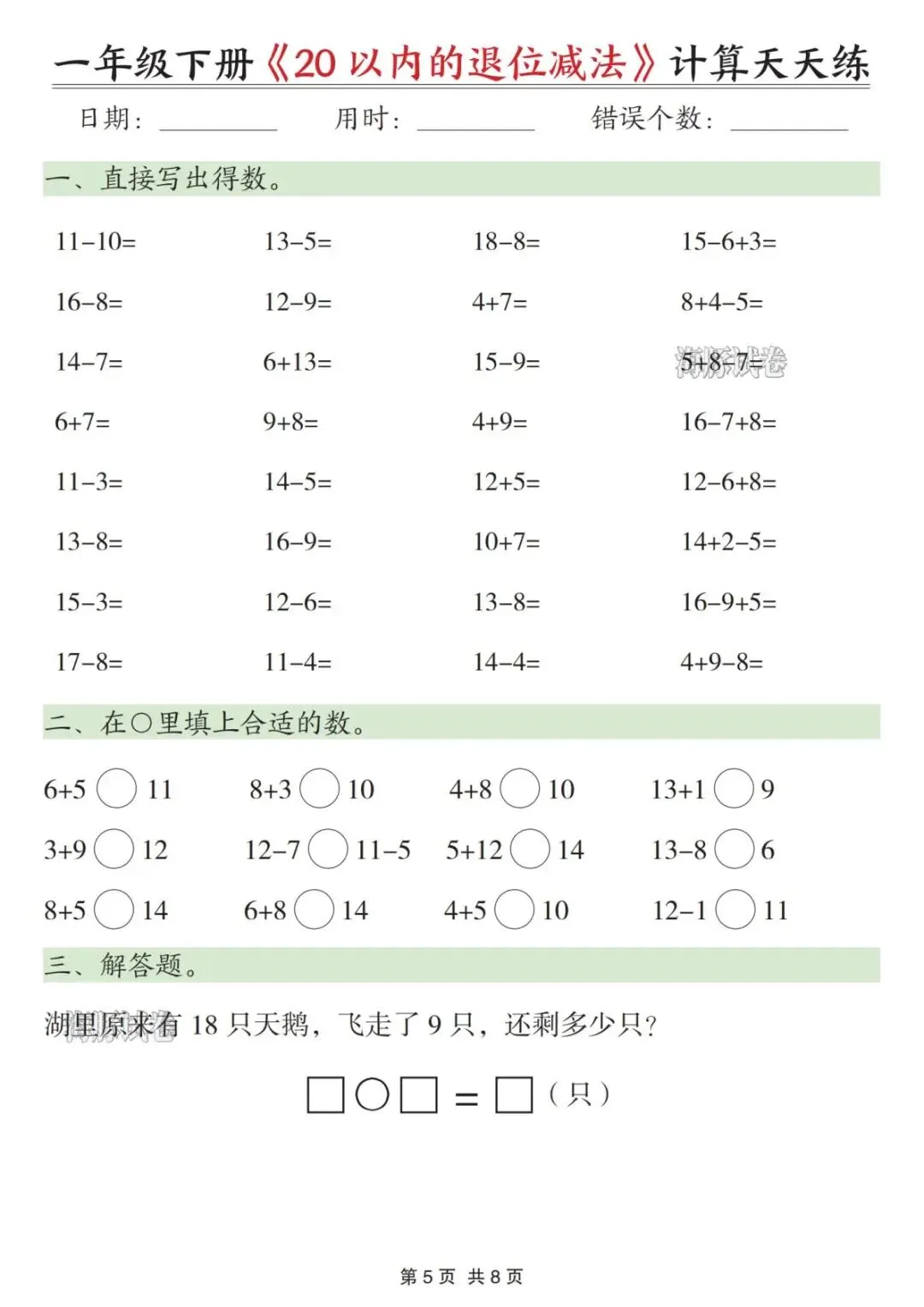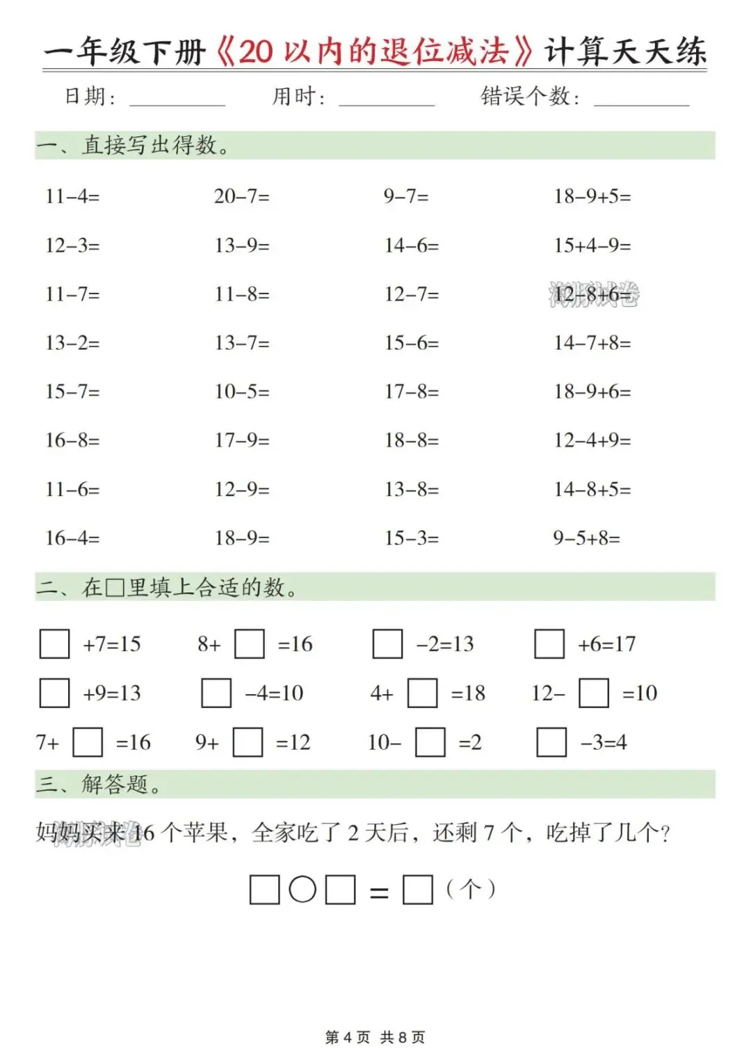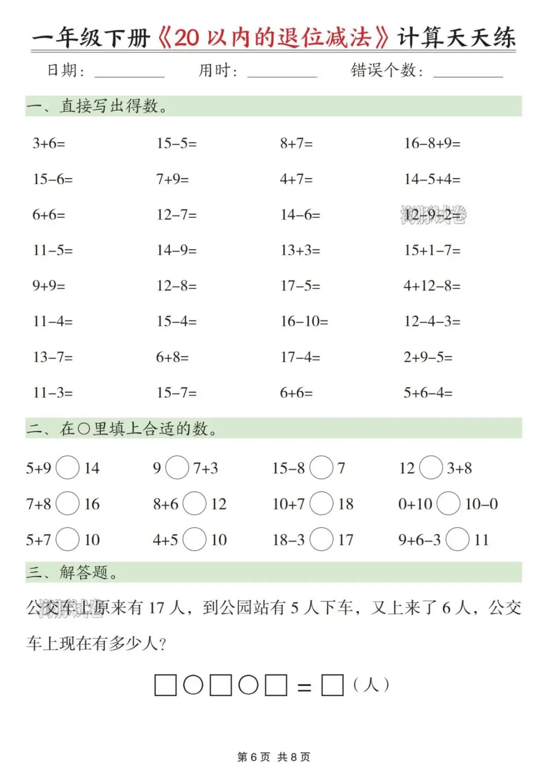 【海豚试卷】一年级(下)数学20以内退位减法天天练(可收藏打印)