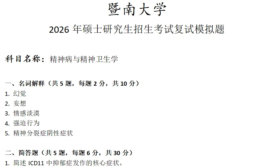 当前位置:首页>考研真题>暨南大学精神病与精神卫生学考研复试真题模拟
