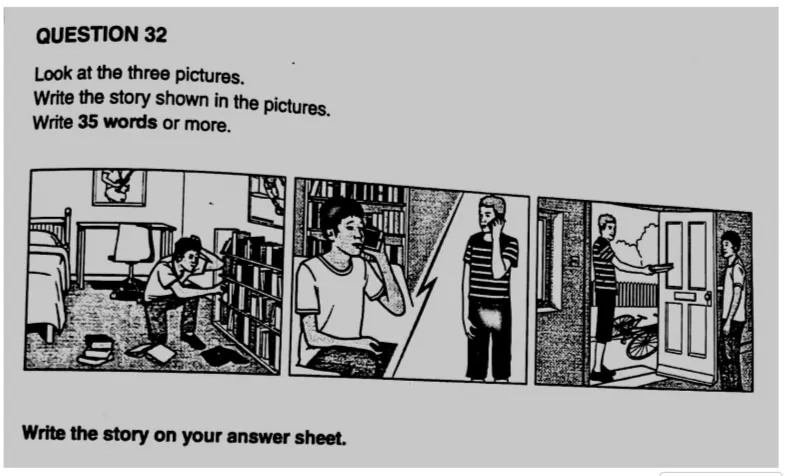 这道题要求根据三幅图(男孩找书——打电话——朋友骑车送书)写35个字以上的故事。