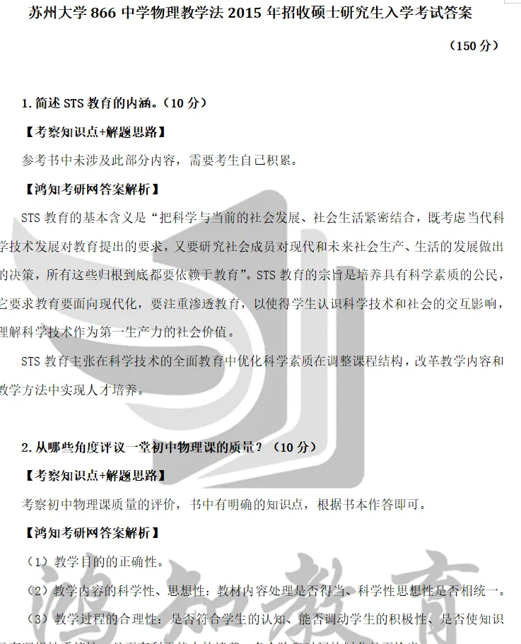 2015年苏州大学866中学物理教学法考研真题答案详解
