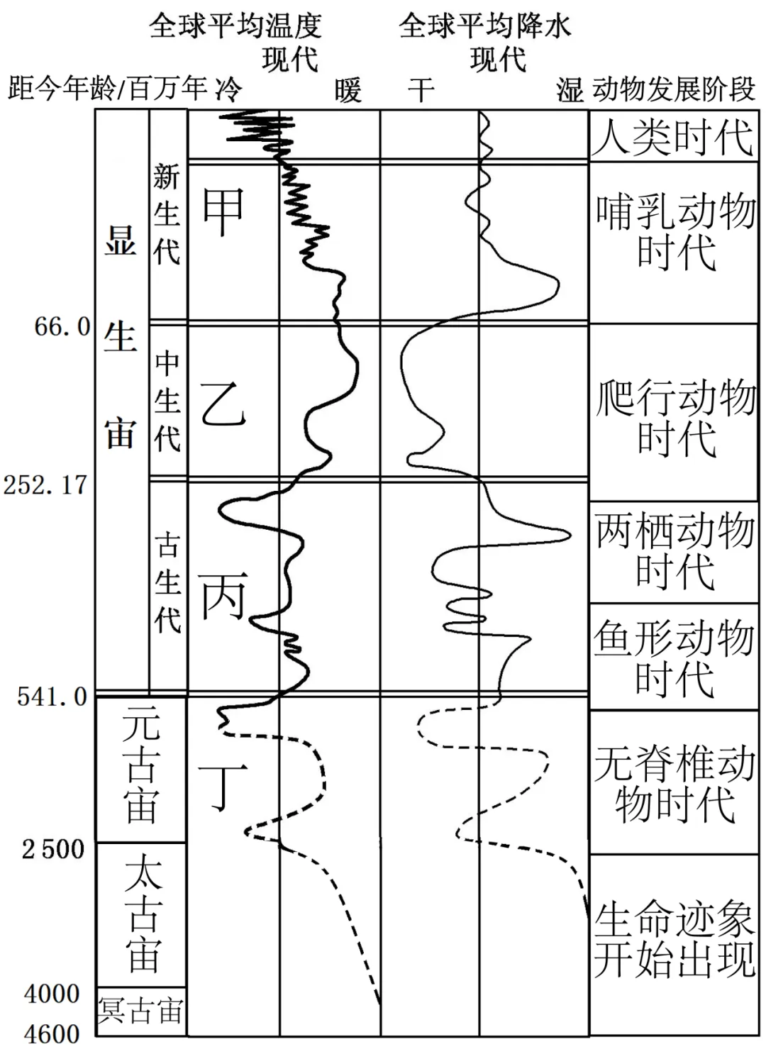 详解:根据图片可知,乙地质时期位于显生宙的中生代,全球平均温度曲线处于相对现代偏暖的阶段,全球平均降水曲线处于相对现代偏干的阶段,因此,乙地质时期的气候特点是暖干,C正确,ABD错误。故选C。