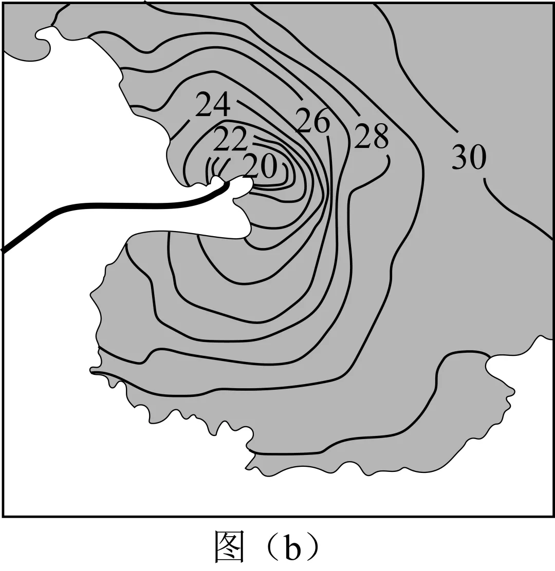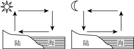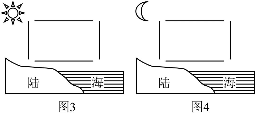 读图3可知,此时是白天,白天海洋吸热的速度较慢,气温较低,气压较高,陆地升温快;气温高,气压低,风从海洋吹向陆地。读图4可知,此时是晚上,晚上海洋放热的速度较慢,气温较高,气压较低;而陆地降温快,气温低,气压高,风从陆地吹向海洋。画图如下:
