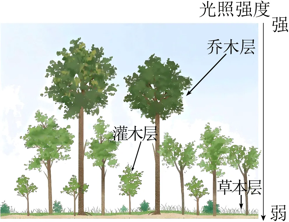 详解:结合所学可知,气候越湿热垂直分层越明显。结合选项可知,热带雨林分布区纬度最低,全年高温多雨,水热条件最好,因此群落的垂直结构最为复杂,垂直分层最明显,D正确;亚热带常绿阔叶林位于亚热带季风气候区,落叶阔叶林位于温带季风或温带海洋性气候区,亚寒带针叶林位于温带大陆性气候区,相对于热带雨林,三者气候并没有那么湿热,ABC错误。故选D。