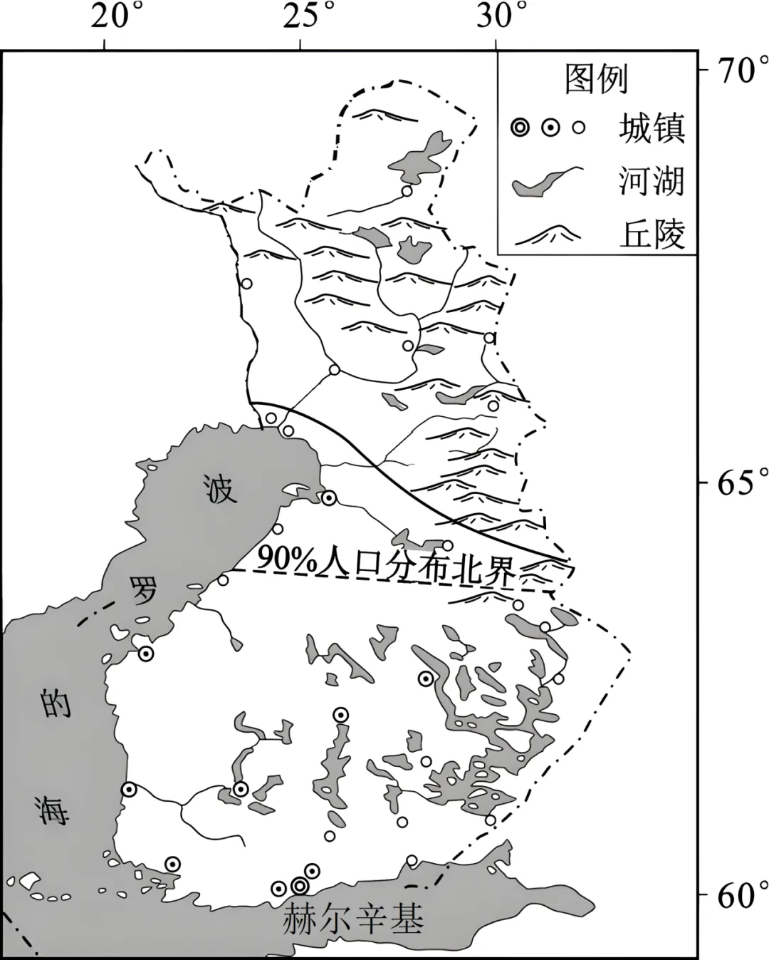 详解:图中南部地区纬度较低,并且靠近波罗的海,气温较高,而北部地区纬度较高,气温较低,人口主要集中在相对温暖的南部区域,所以影响芬兰人口分布的主要因素是气温(自然环境),A正确;芬兰整体纬度较高,温度(热量)是影响人口分布的主导因素,与温度相比,国家政策、河流分布对人口分布的影响相对较小,CD错误;温度分布影响了城镇分布,进而导致了经济水平的差异,故经济水平不是主导因素,B错误。故选A。