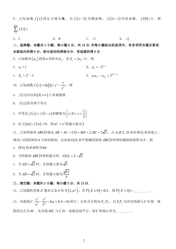 多选题注重考查知识的完整性与逻辑的严密性。第9题(数列) 通过递推关系,考查学生是否能正确处理边界条件,以及等比数列的通项与求和。第11题(立体几何) 综合考查四面体的外接球、内切球、截面最值问题。题目条件多变,选项涉及面积最值、球心距等,对空间想象能力要求极高。3. 填空题(12-14题):计算与技巧并重第13题(双曲线) 以圆与双曲线交点为背景,结合渐近线平行条件,考查离心率求解。方法巧妙,需将几何关系转化为代数方程。第14题(解三角形) 通过边角关系推导出最小值。此类题目需灵活运用正余弦定理与基本不等式,是典型的高考压轴填空风格。