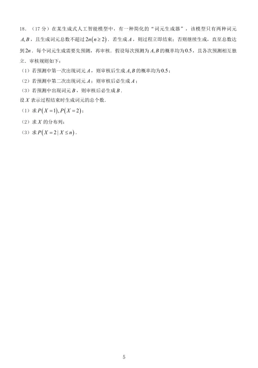 以“词元生成器”为背景,引入复杂的审核规则:求基本概率;求分布列;求条件概率题目新颖,信息量大,考查学生对新定义的理解能力与概率建模能力,是本次试卷的创新亮点。