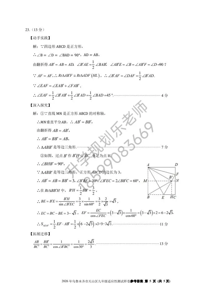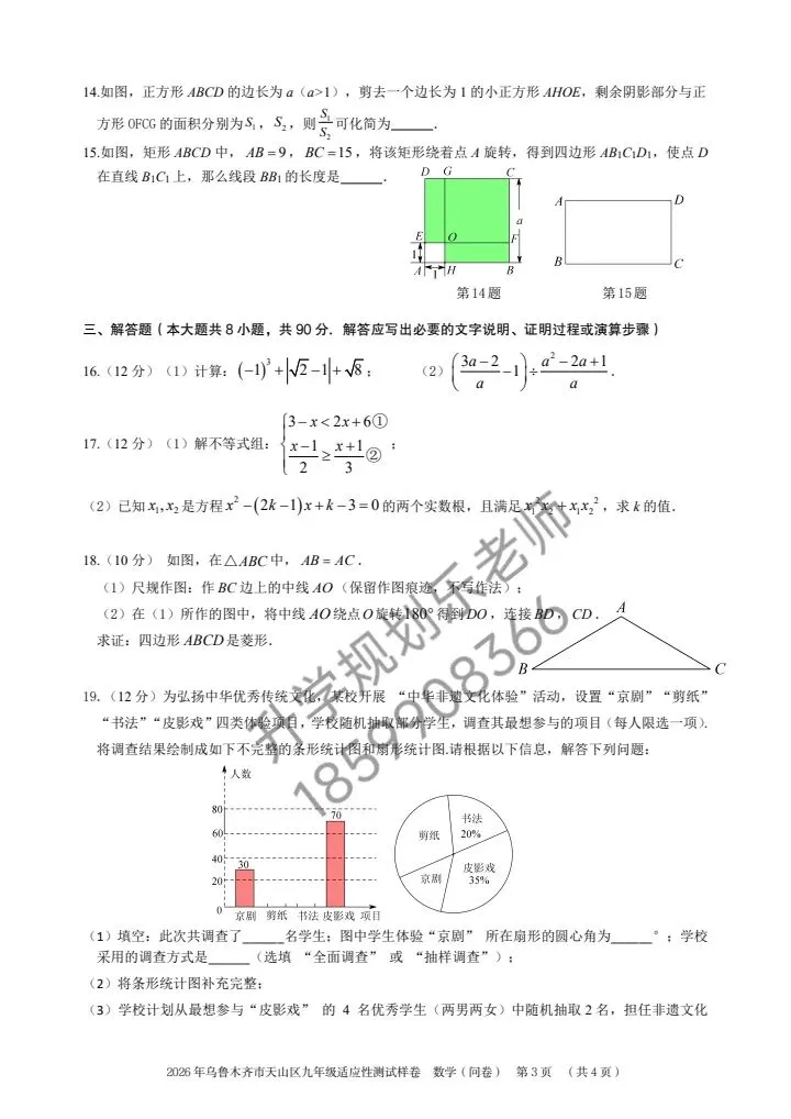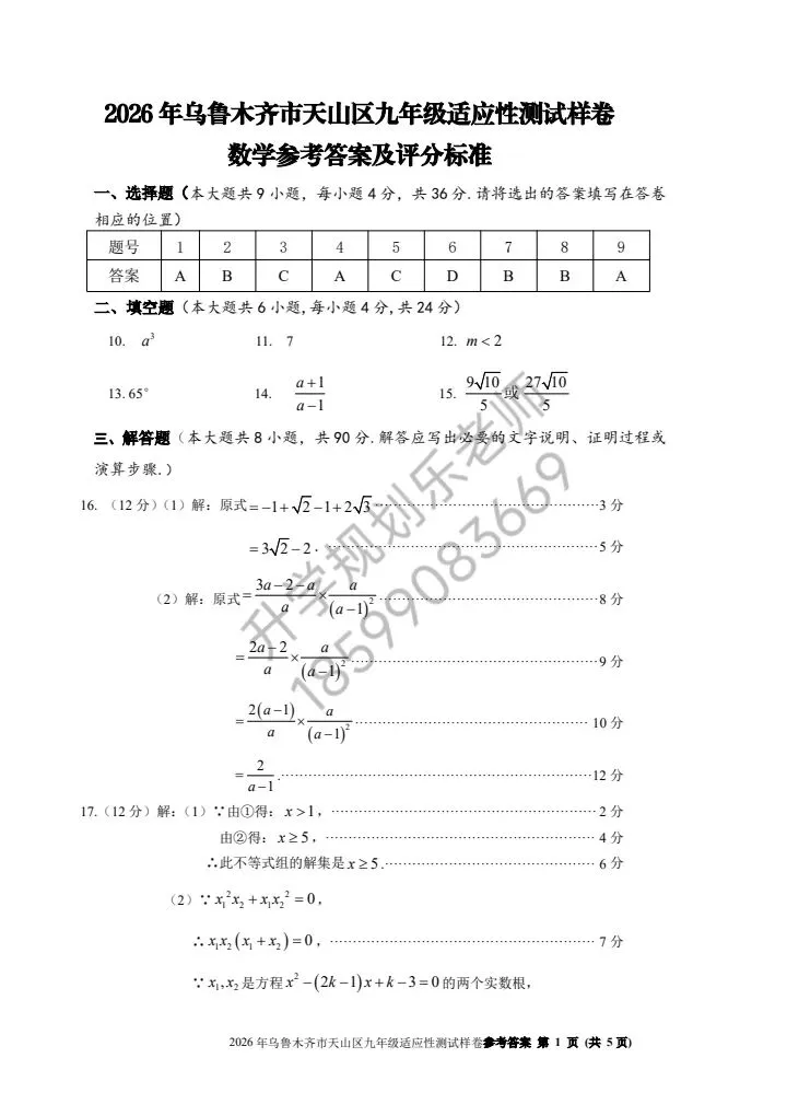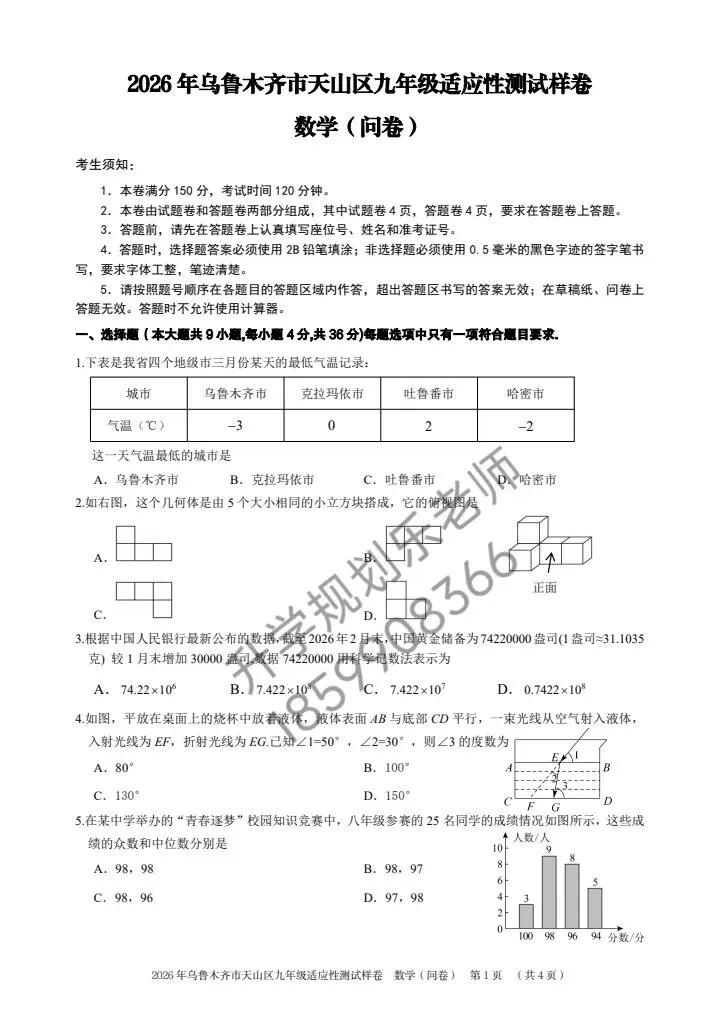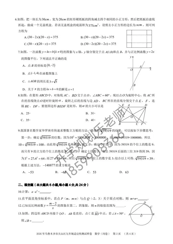 随着2026年中考备考进入关键阶段,2026年乌鲁木齐市天山区九年级数学适应性测试样卷正式亮相!这份贴合本地考情的测试卷,既是中考前的重要“热身赛”,也是孩子查漏补缺、精准提分的核心资料。今天就带大家深度拆解试卷核心考点,帮家长和孩子理清备考方向!
