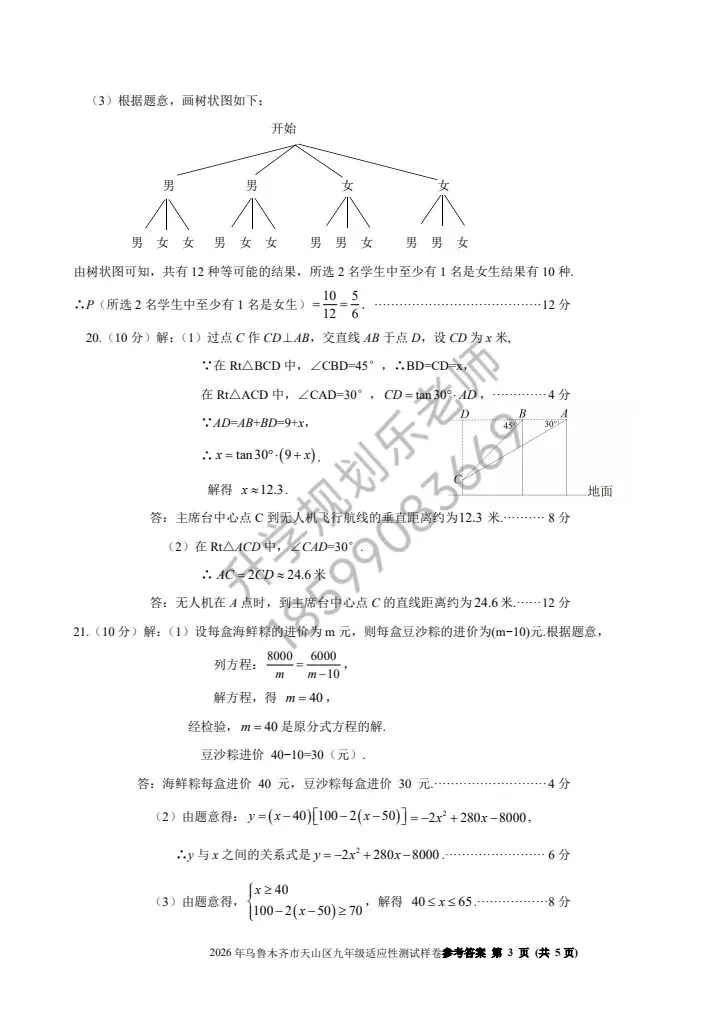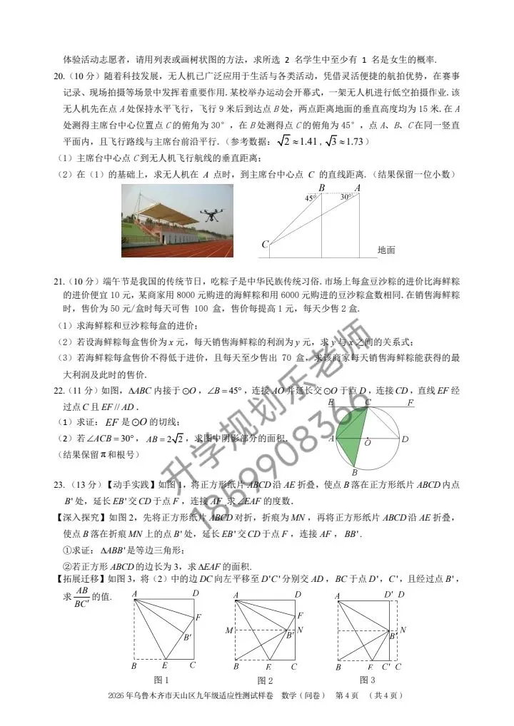 4. 实际应用类(第20、21题):无人机俯角问题、海鲜粽利润问题,结合生活场景考查数学建模,第20题需将俯角转化为直角三角形边角关系,第21题要找准进价、售价、销量的等量关系,列方程前务必审清题意,区分进价与售价关系。