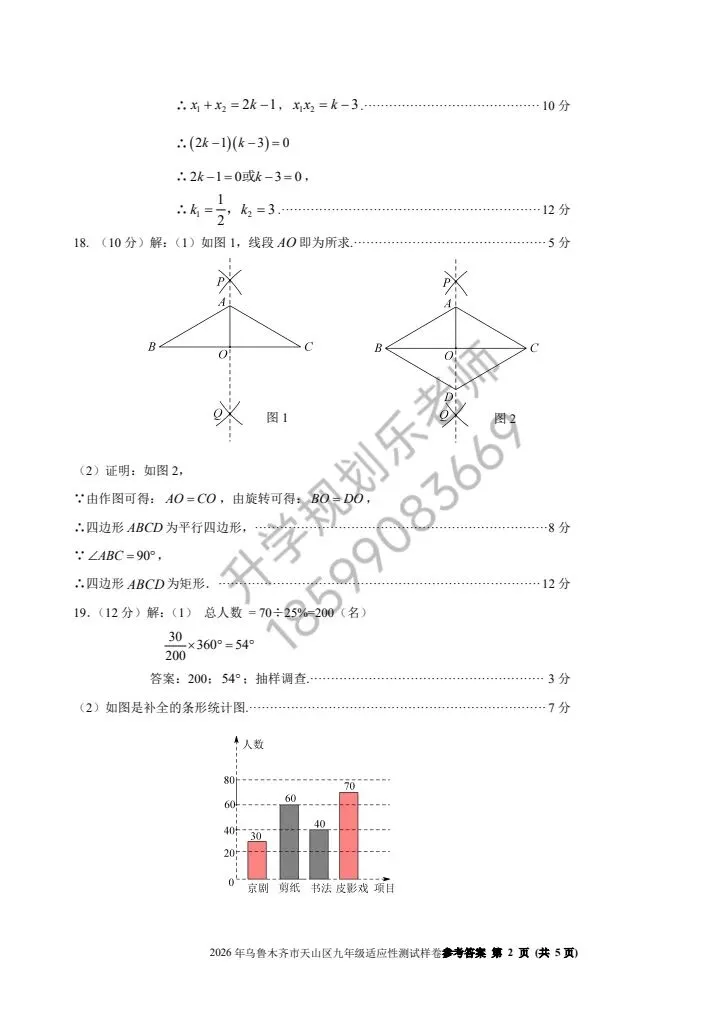 3. 几何证明类(第18、19题):菱形判定、统计与概率,是中档题核心考点,第18题需掌握中线倍长法证明菱形,第19题要读懂统计图表,用列表法/树状图求概率,统计题先算总数再补全图表,避免低级错误。