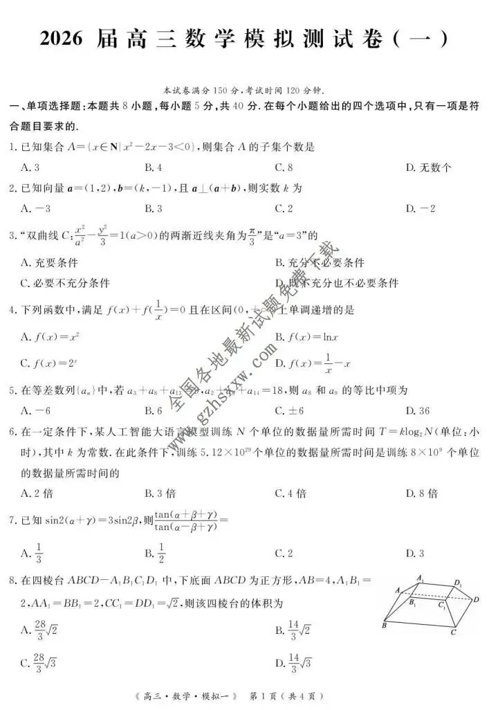 >《高中试卷》湖北省黄冈市八模2026届高三上学期模拟测试卷(一)数学(含答案)
