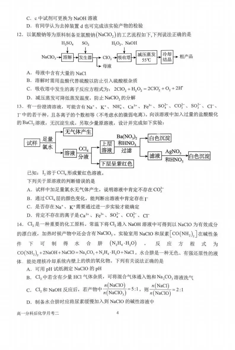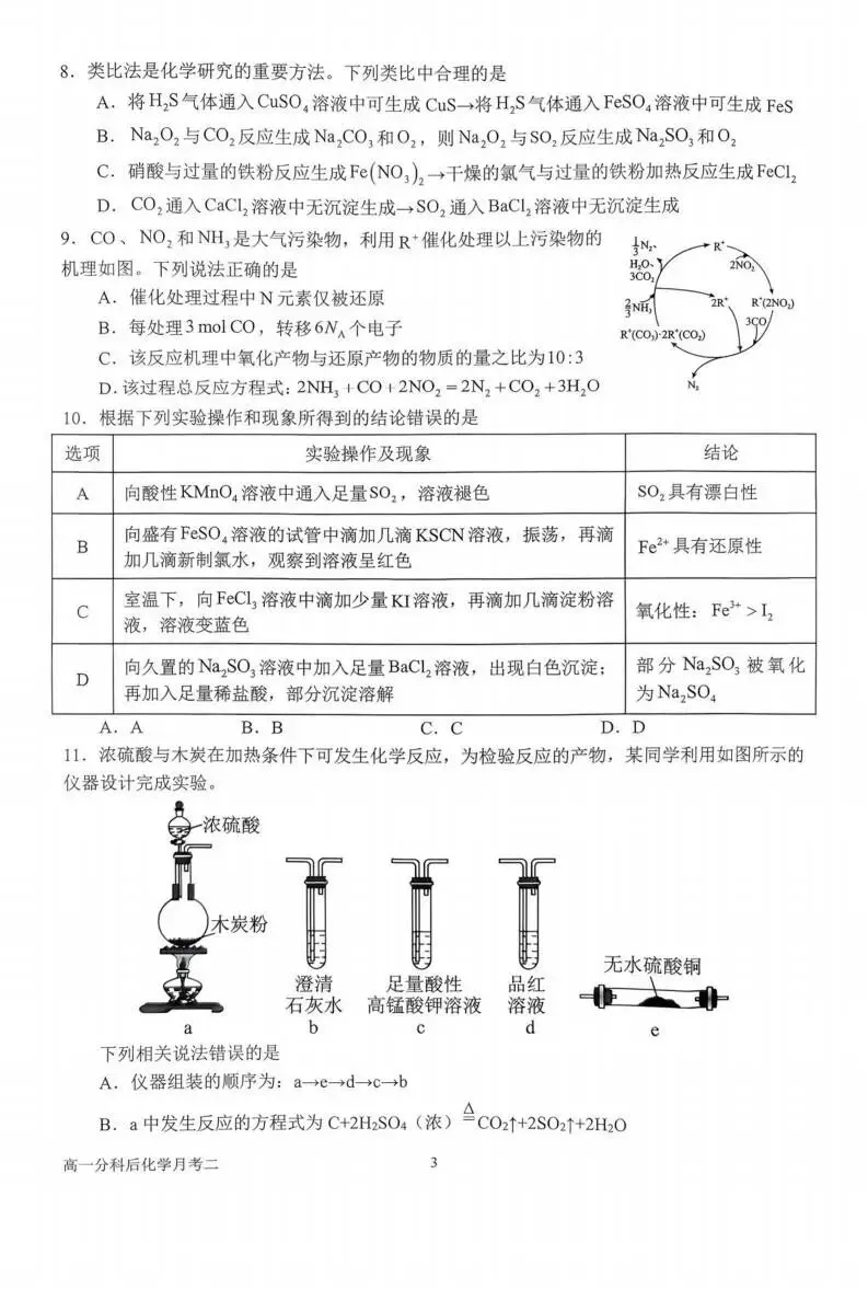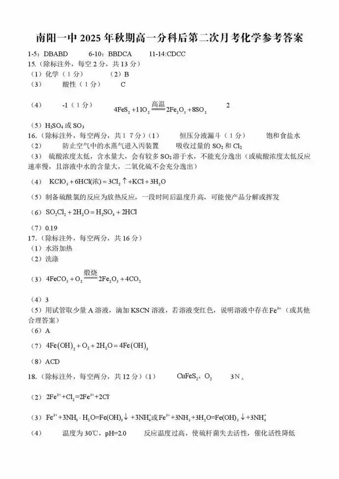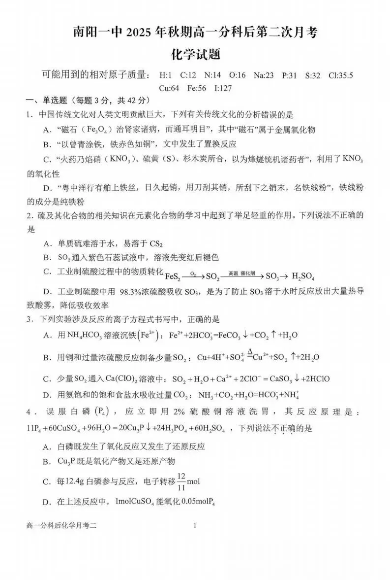 >《高中试卷》南阳市第一中学校2025-2026学年高一上学期分科后第二次月考化学(含答案)