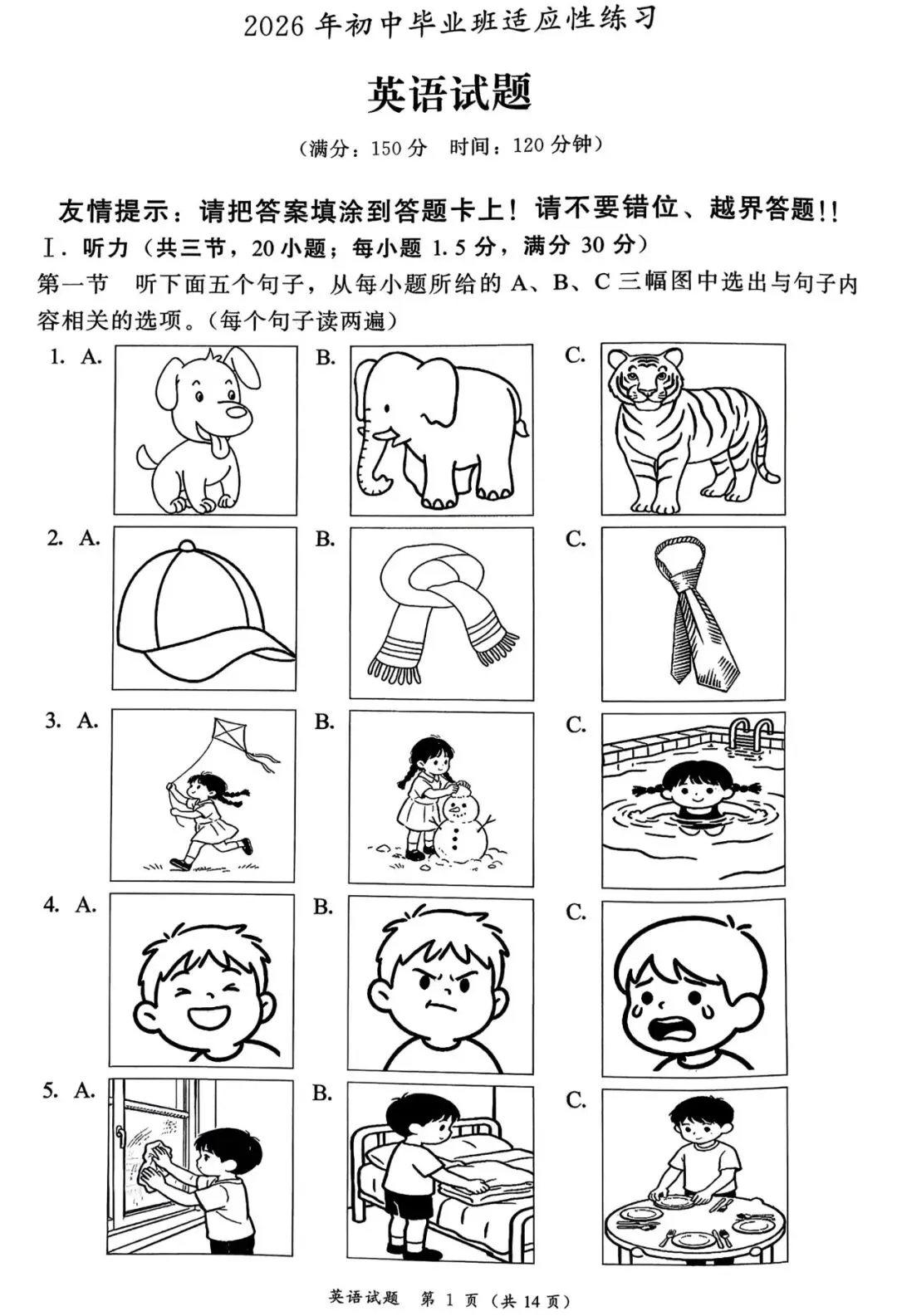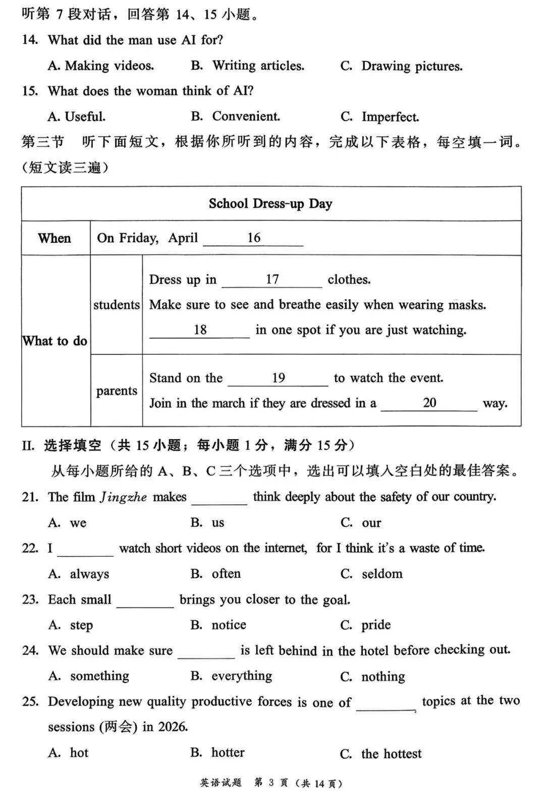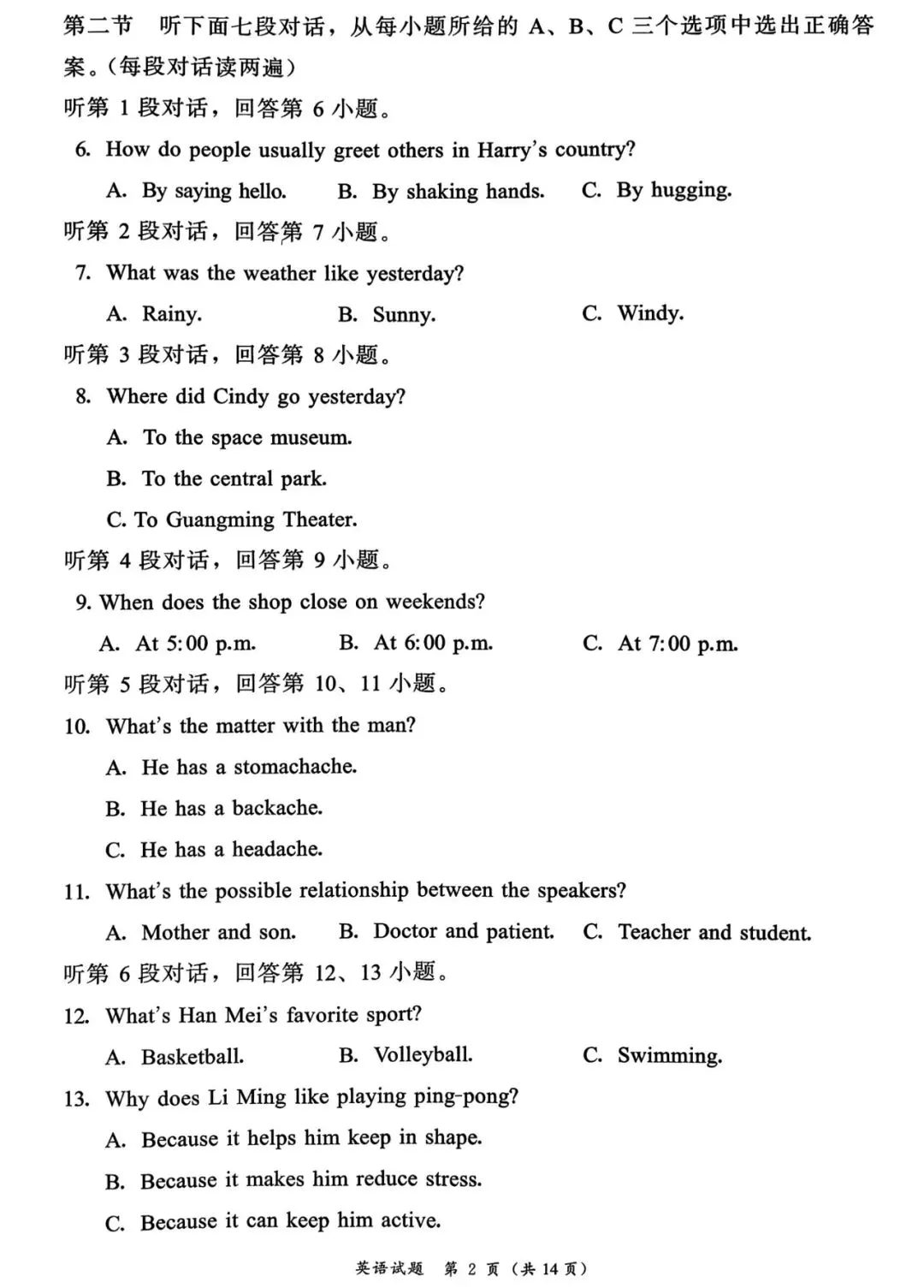 一、听力(共三节,20小题,每小题1.5分,满分30分)