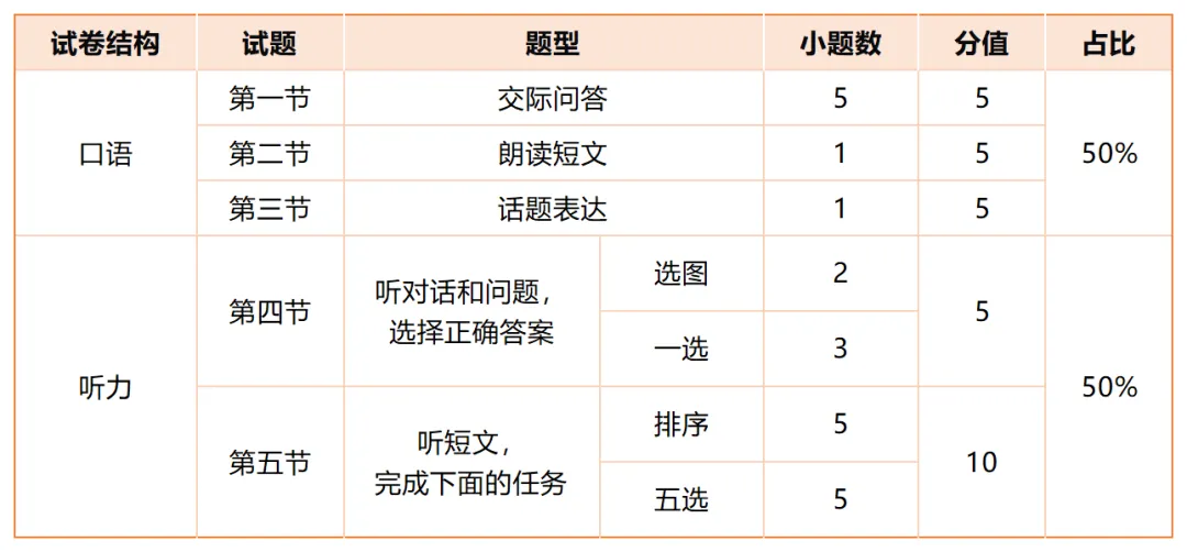 口语模块(15分):3个题型,核心考查口语表达能力,难度核心在话题表达。