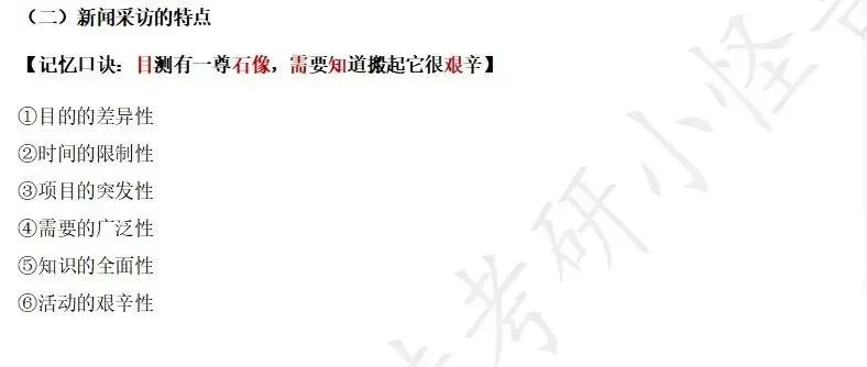 在使用本笔记时,应着重对新闻写作的不同新闻体裁着重进行名词解释的理解记忆。本笔记在考试中最常以名词解释及简答题的方式出现,覆盖面全且重复率高,因此务必结合真题链接部分内容加强知识重点的记忆。此外,针对一些记忆点多且复杂的部分小编给出了记忆口诀辅助记忆,前两次记忆可能会有些奇怪或者拗口,但是三次过后会达到“奇效”,这在后期的“车轮战”背书中的省时省力优势会非常明显。
