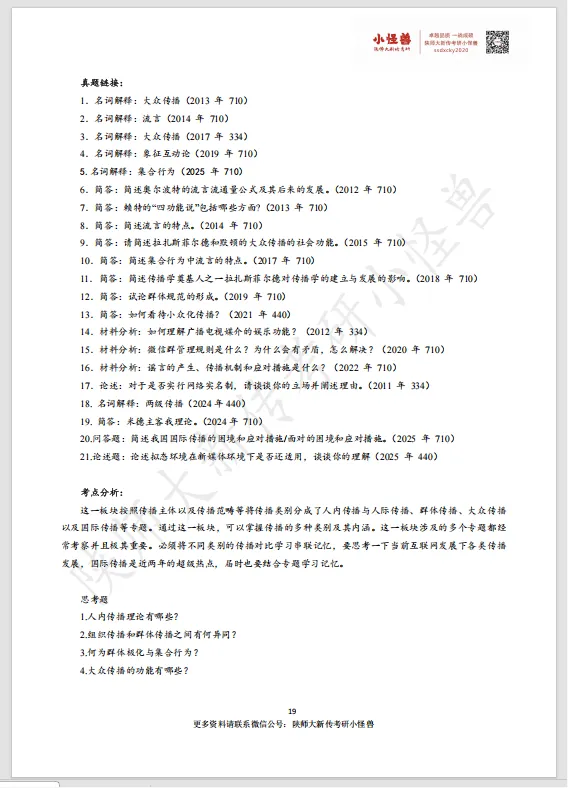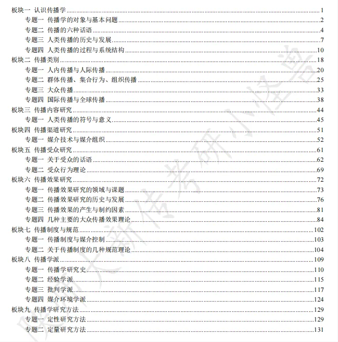 以《传播学教程》为例,大部分学校都会考这本书,但是每个学校的重点不一样,同一个学校每年的重点也不一样,这也是怪兽针对陕西师范大学新传考研每年都修订一次的原因。 在陕西师范大学新传考研指定的参考书中,《传播学教程》出题量最大,所以怪兽也是极尽全力,翻看多本参考书整理而成。