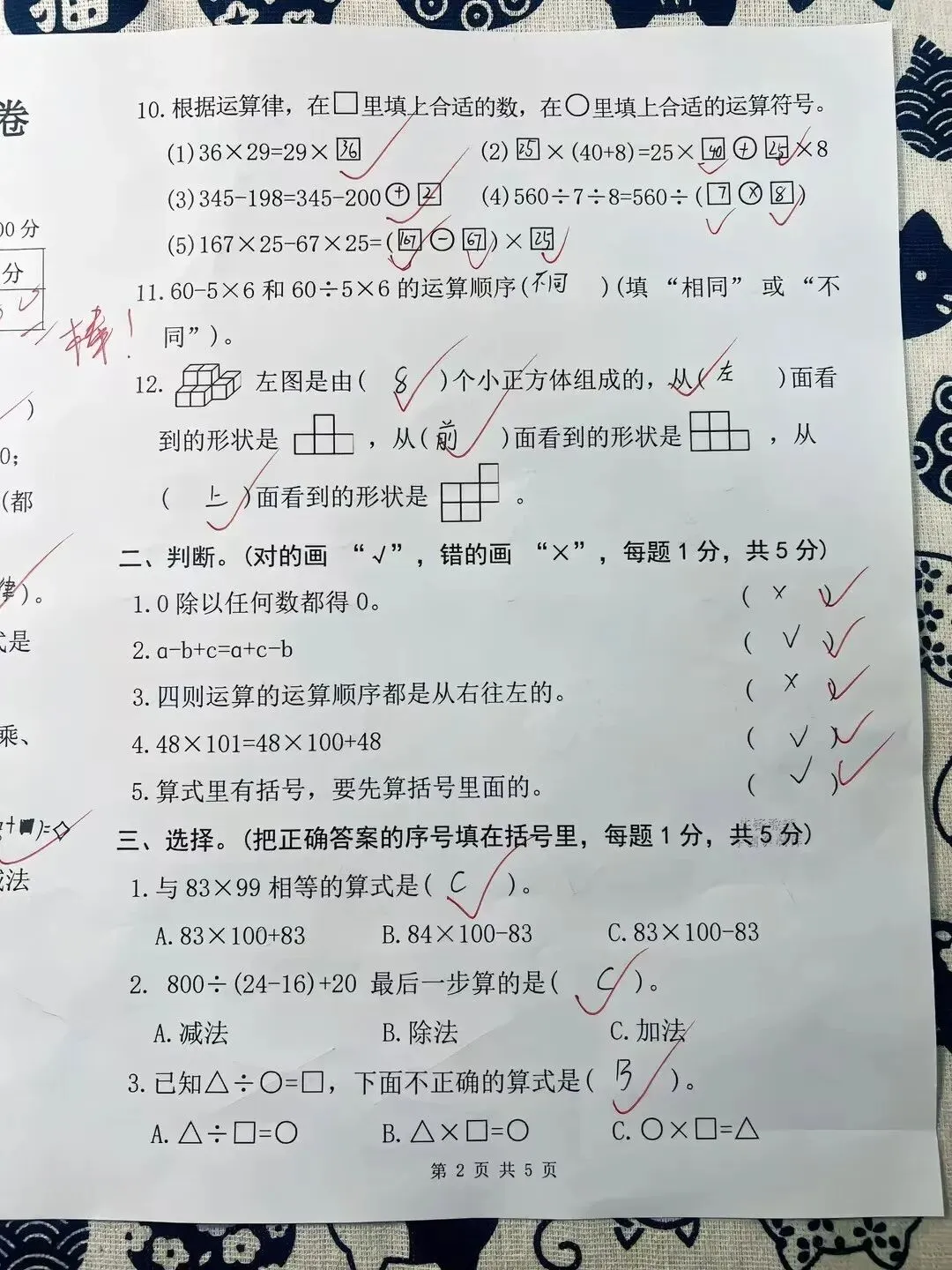 >四下数学第一次月考试卷来啦,题型有点难度,还没考的可以参考下#四年级 #四年级下册数学 #月考 #