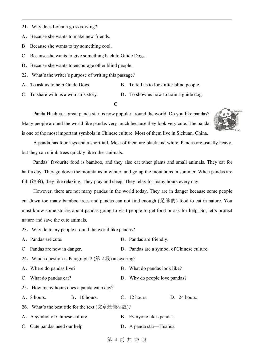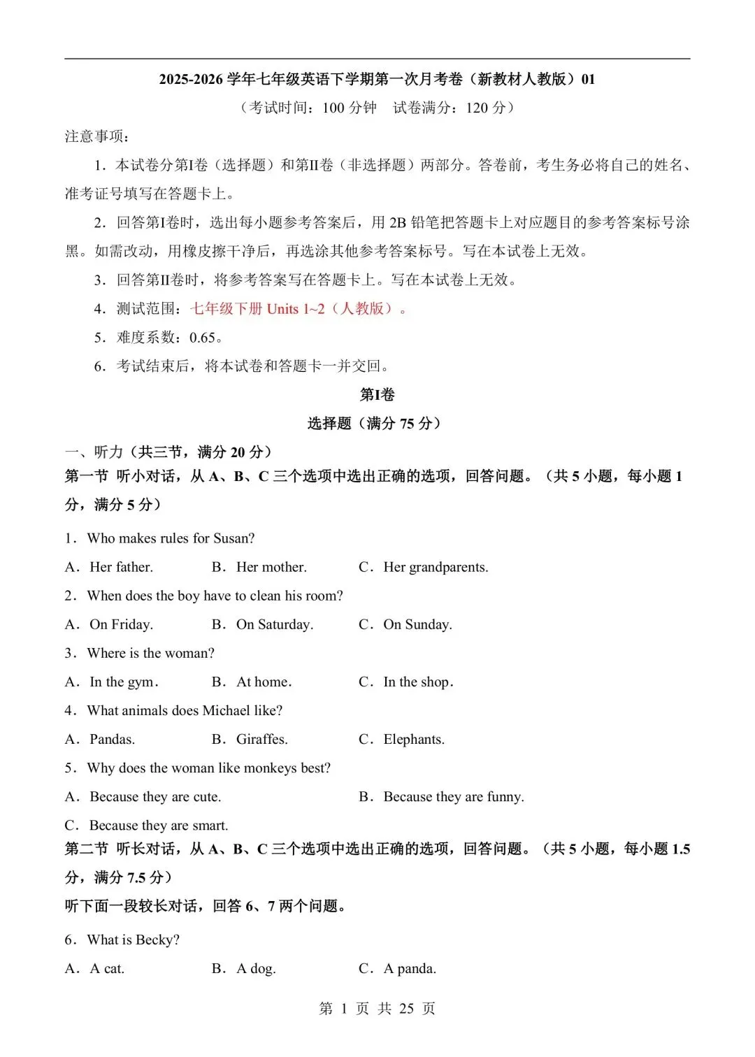26年春七年级下册人教版英语第一次月考试卷含答案,电子版可打印