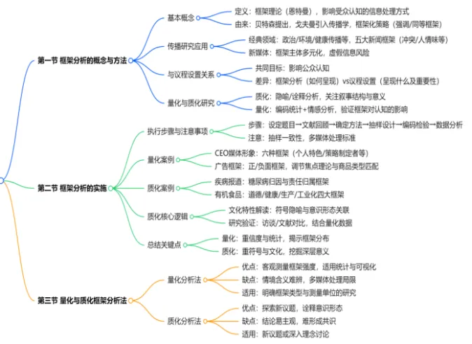 《传播学研究方法》第八章“框架分析法”:框架图将“框架分析基本概念→实施步骤→方法比较→新媒体影响”的内容可视化,不同方法的优缺点一目了然,瞬间理清框架分析法的逻辑链条。