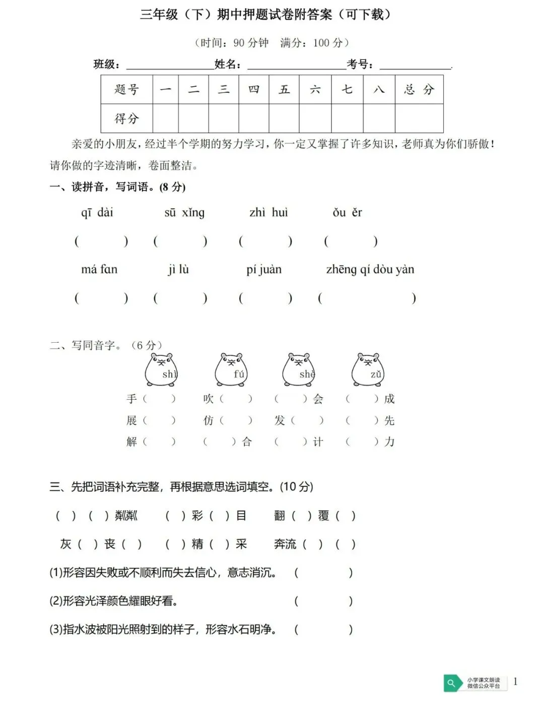 2026春一年级下册语文《第三单元检测试卷》(共2套,附答案)电子版可打印