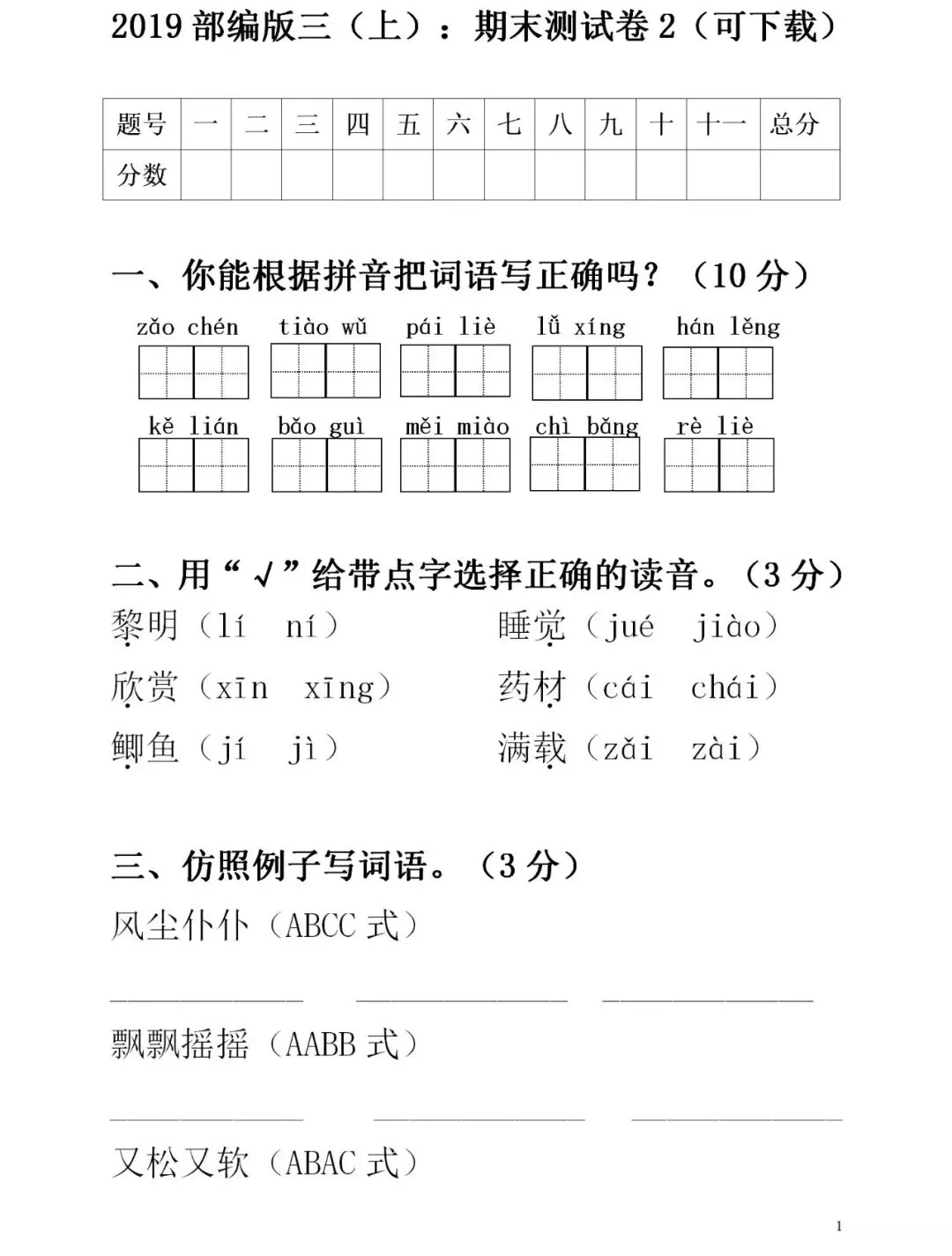 部编版三(下)第一单元测试卷(可下载)