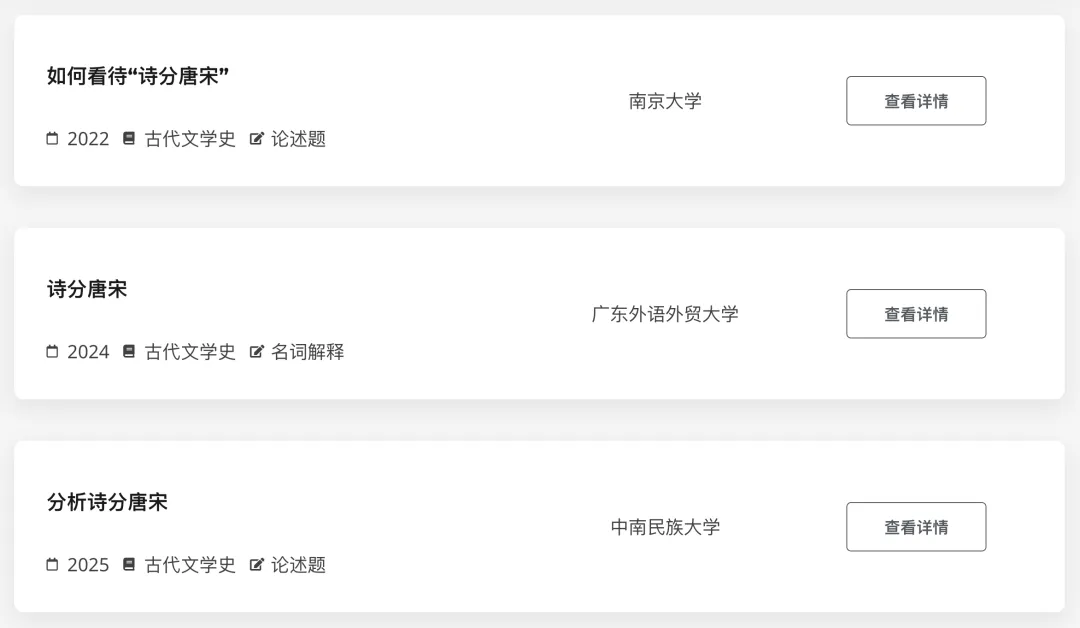 下面来到了论述题,第一题问的是“清人蒋士铨说“宋人生唐后,开辟真难为”,试论述宋人对唐诗的继承与发展。” 这题不难,是经典的考题:唐宋诗的对比。“诗分唐宋”,近5年各院校总共考了5次,其中26年还有复旦大学和四川大学考到。