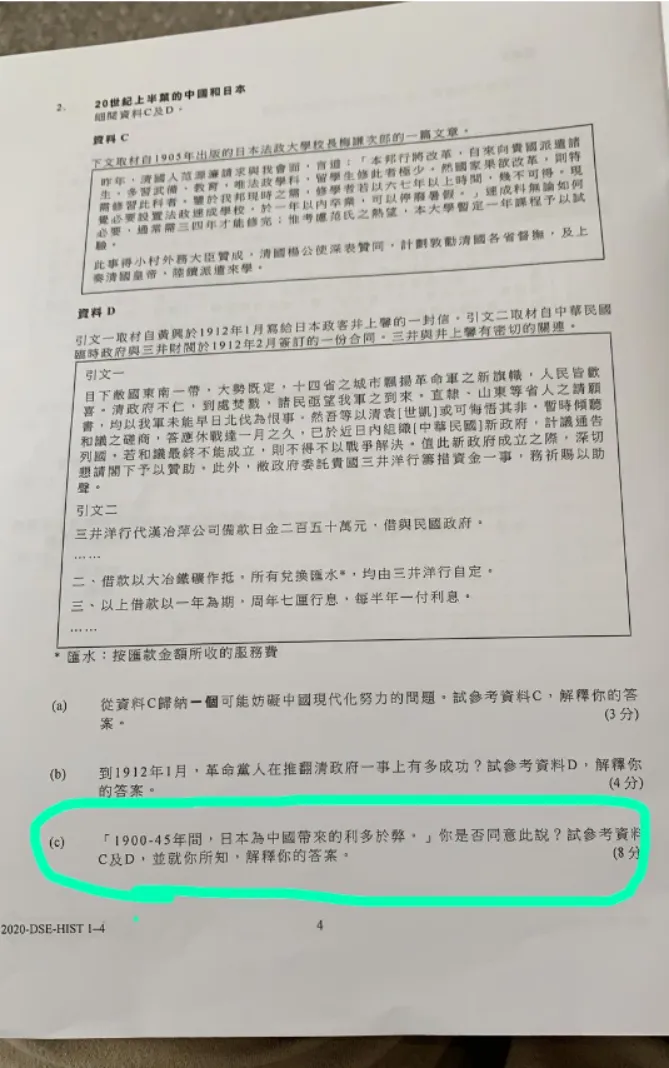 2020年DSE历史试卷题目。(图源:香港“大公文汇全媒体”)据香港“大公文汇全媒体”14日报道,2020年香港中学文凭考试(DSE,香港“高考”)历史科考试今日(14日)举行。在历史卷一第二题考核20世纪上半叶的中国和日本的关系,要求学生参考试卷提供的资料,回答是否同意“1900-1945年间,日本为中国带来的利多于弊”的说法并进行解释。