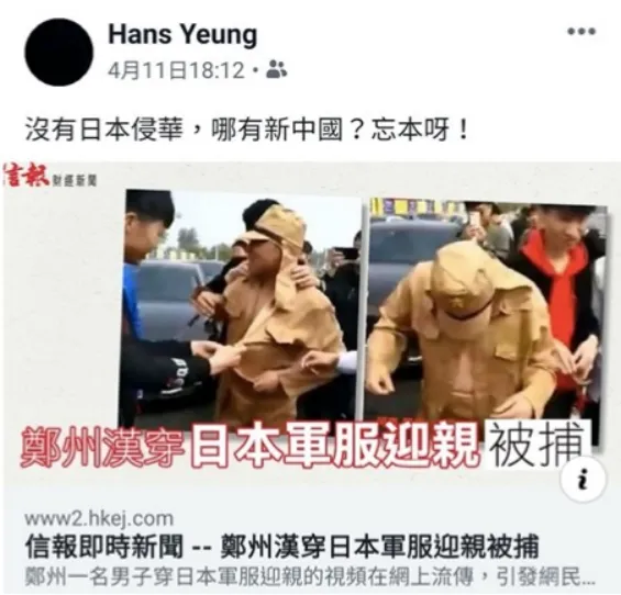 疑为杨颖宇的社交账户,曾转发一则去年四月郑州有人穿日本军服迎亲被拘留的新闻,并发表“没有日本侵华,哪有新中国?忘本呀!”的荒谬言论。