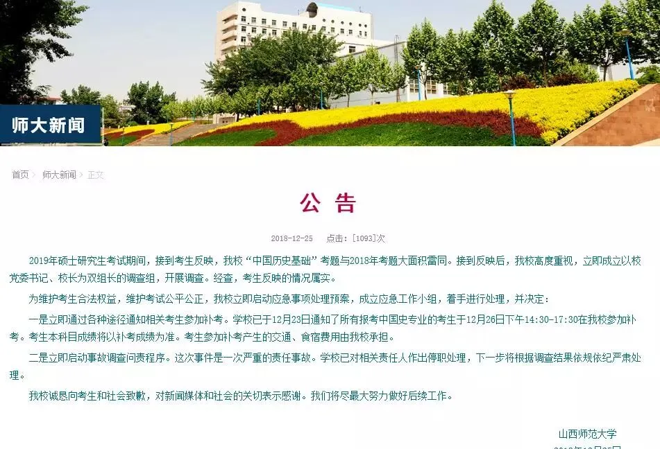 今年12月23日与24日为全国统一考研时间。24日下午考研刚结束,有考生在网上反映,今年山西师大中国史的试题与2017年雷同,疑似试卷有误,考生称收到山西师大研究生院发来信息,通知在26日下午2点半到5点半重新考试。