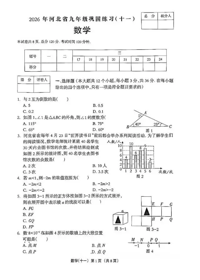 2026年3月河北初中学业水平摸底考数学试卷