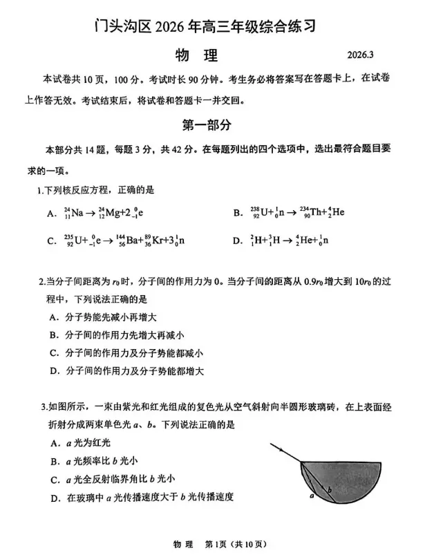 北京市门头沟区2026年高三一模物理试题试卷及答案,答案更新中,一模试卷难度如何?您考的怎么样?欢迎您评论留言,具体试卷如下: