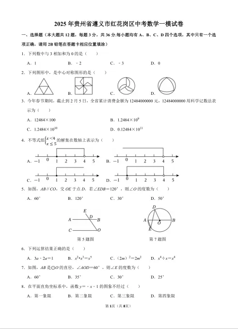 2025年遵义市红花岗区中考数学一模试卷,是一份质量较高的模拟试卷。它既考查了学生的基础知识和基本技能,又注重对学生核心素养和综合能力的考查,对后续复习具有很好的导向作用。