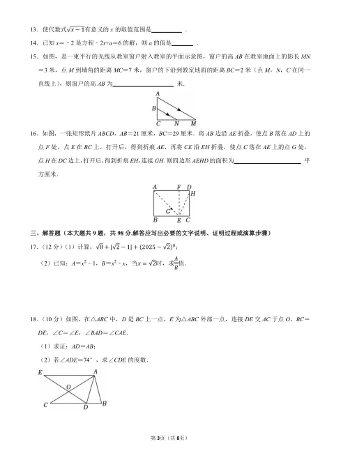 几何折叠问题是本次试卷的“高频考点”,建议:系统整理折叠问题的常见模型(如折痕过顶点、折痕平行于边、折痕经过某点等);掌握折叠问题的核心:折叠前后对应线段相等、对应角相等;熟练运用勾股定理、相似三角形、方程思想解决问题。函数实际应用也是必考内容,建议:掌握一次函数、反比例函数、二次函数的基本性质;加强“审题—建模—求解—验证”的解题流程训练;关注生活中的数学问题,如利润问题、抛物线运动问题等。