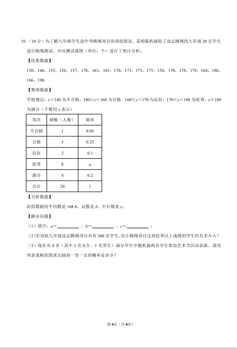 核心考点:数据收集、整理与分析(第19题)、频数分布表、众数、中位数(第19题)、用样本估计总体(第19题)、列表法或树状图求概率(第19题)。命题特点: 统计概率部分集中在一道综合题中,考查形式规范,覆盖了数据分析和概率计算的核心内容。