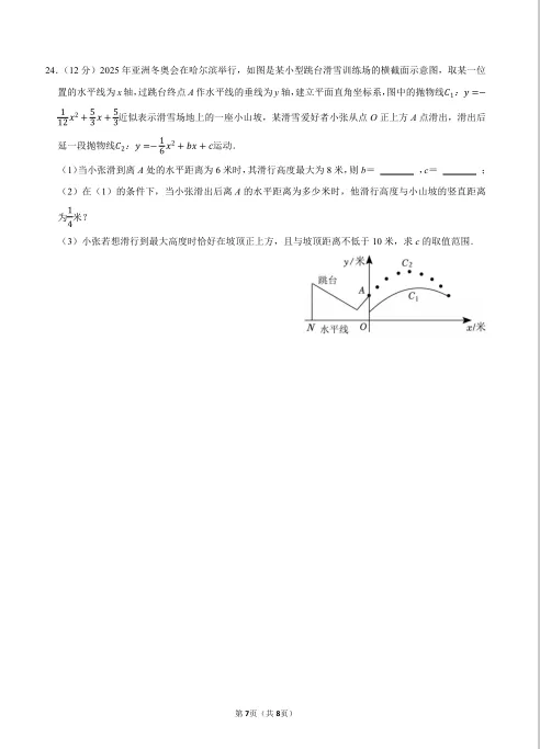 题目以冬奥会跳台滑雪为背景,设计了三问:第(1)问:求抛物线解析式参数;第(2)问:求特定高度差对应的水平距离;第(3)问:求参数取值范围。这是本次试卷的压轴题之一,既考查了二次函数的基础知识,又考查了函数与不等式的综合应用,体现了较高的区分度。