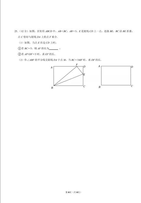 作为全卷的最后一道题,本题设置了两个大问,包含三个小问:第(1)①问:已知一边求另一边长度;第(1)②问:利用乘积条件求线段长;第(2)问:引入角平分线,在比例条件下求线段长;题目设计层层递进,从基础到综合,既考查了折叠问题的基本解法,又考查了分类讨论、方程思想等数学思想方法。