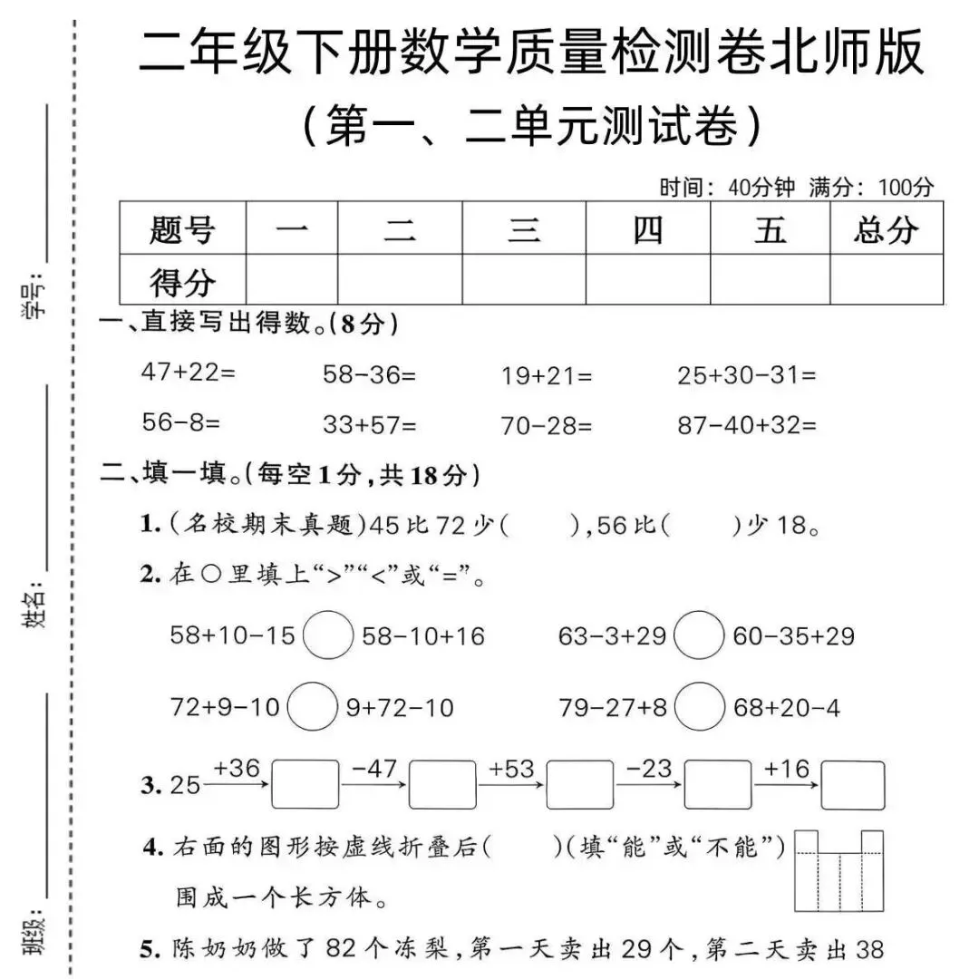 2026春二年级下册北师大版数学,第一次月考检测试卷2套含答案,可打印