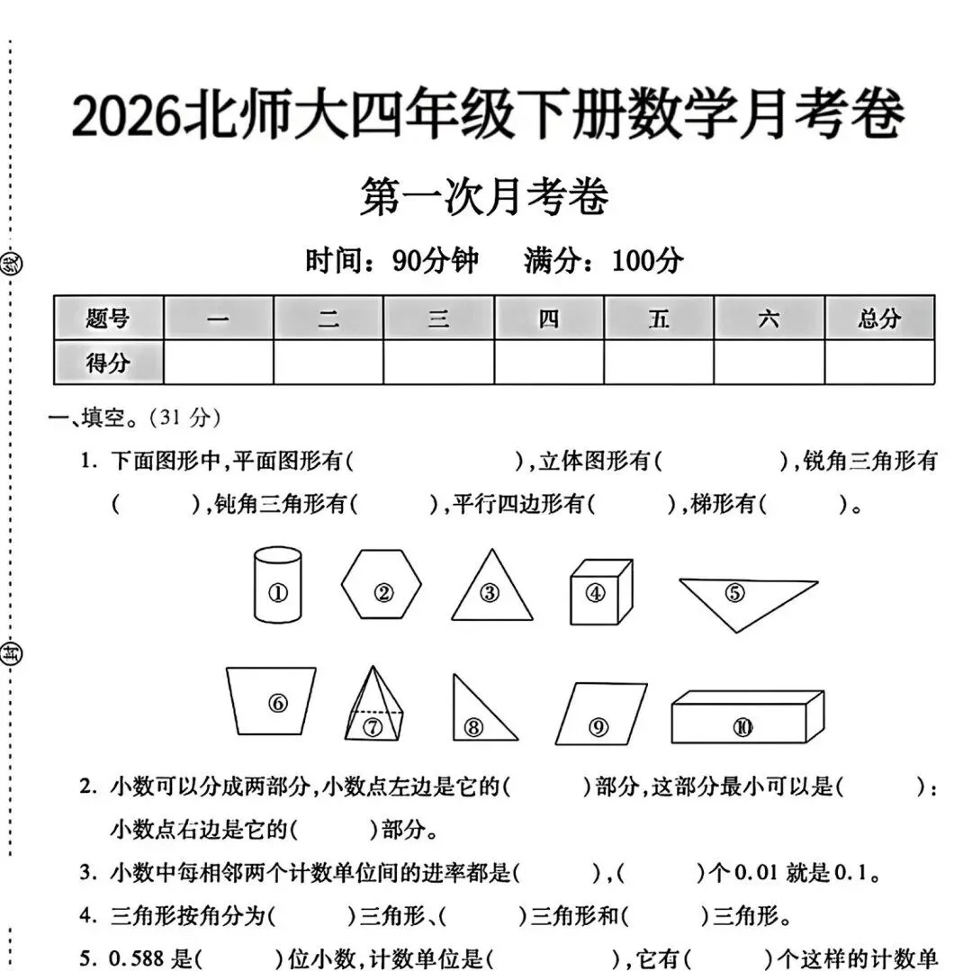 2026春四年级下册北师大版数学,第一次月考检测试卷2套,含答案可打印