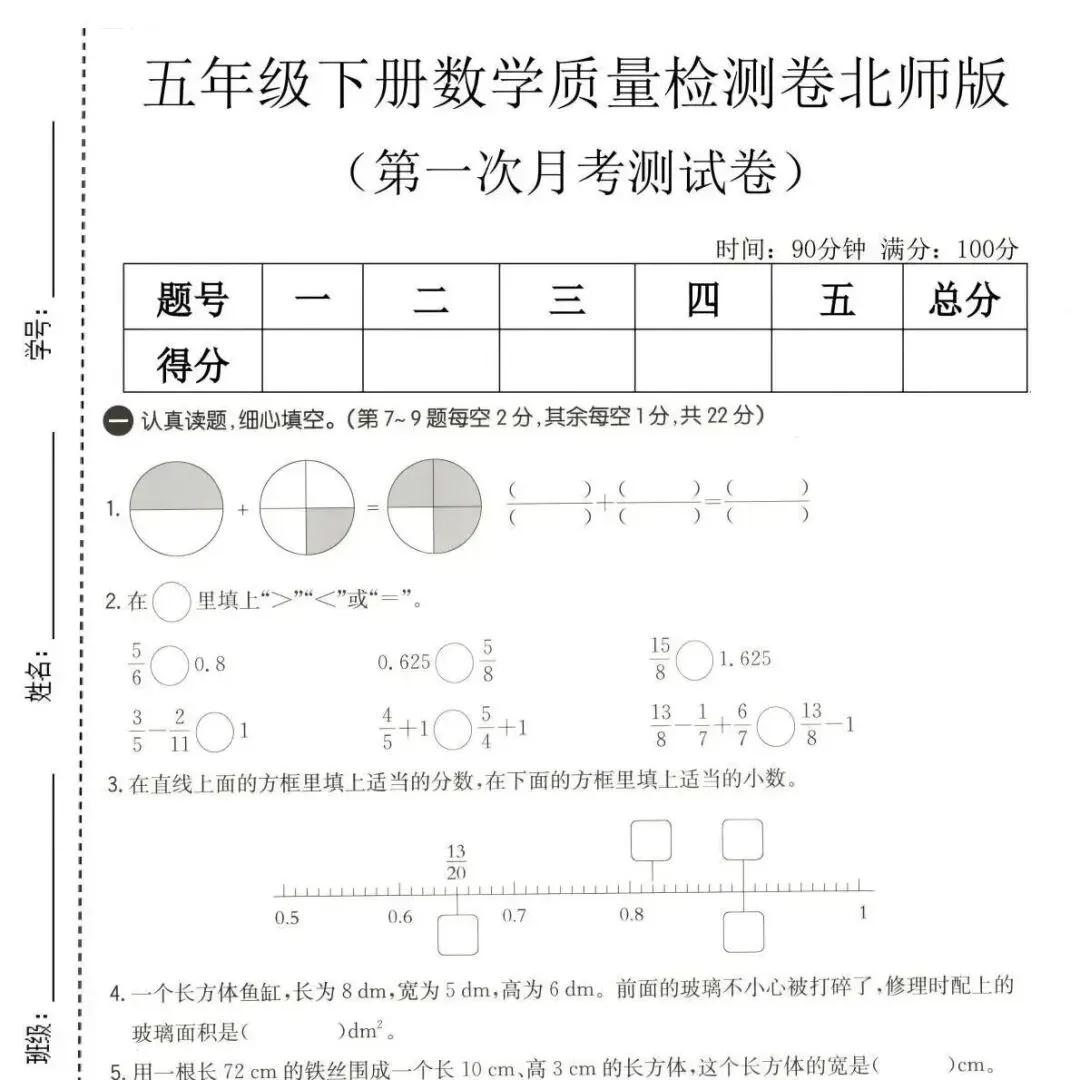 2026春五年级下册北师大版数学,第一次月考检测试卷2套,含答案可下载打印