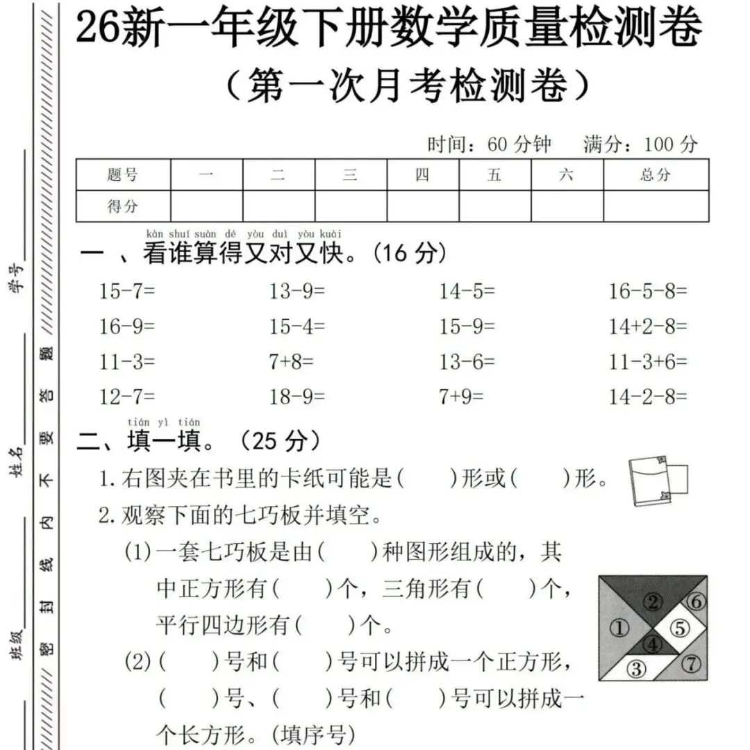 2026春一年级下册人教版数学《第一次月考质量检测卷》(含答案),电子版可下载打印