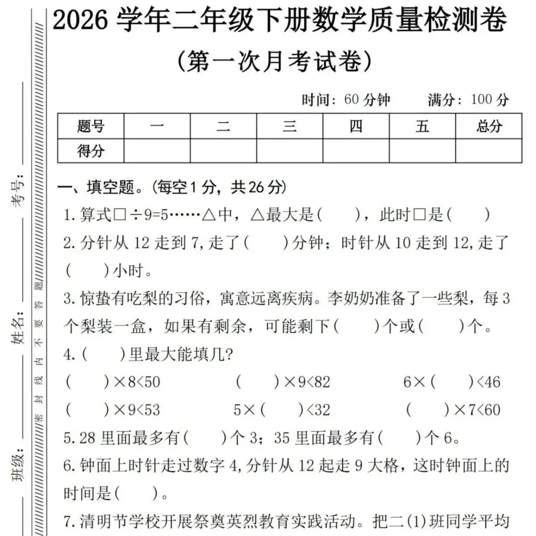 2026春二年级下册人教版数学《第一次月考质量检测卷》(含答案),电子版可下载打印
