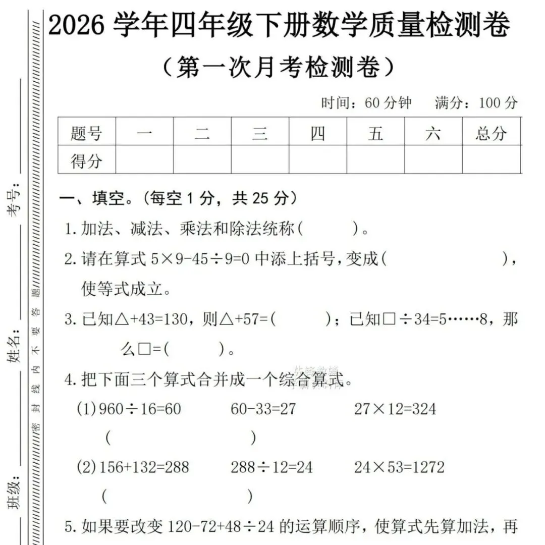 2026春四年级下册人教版数学《第一次月考质量检测卷》(含答案),电子版可下载打印