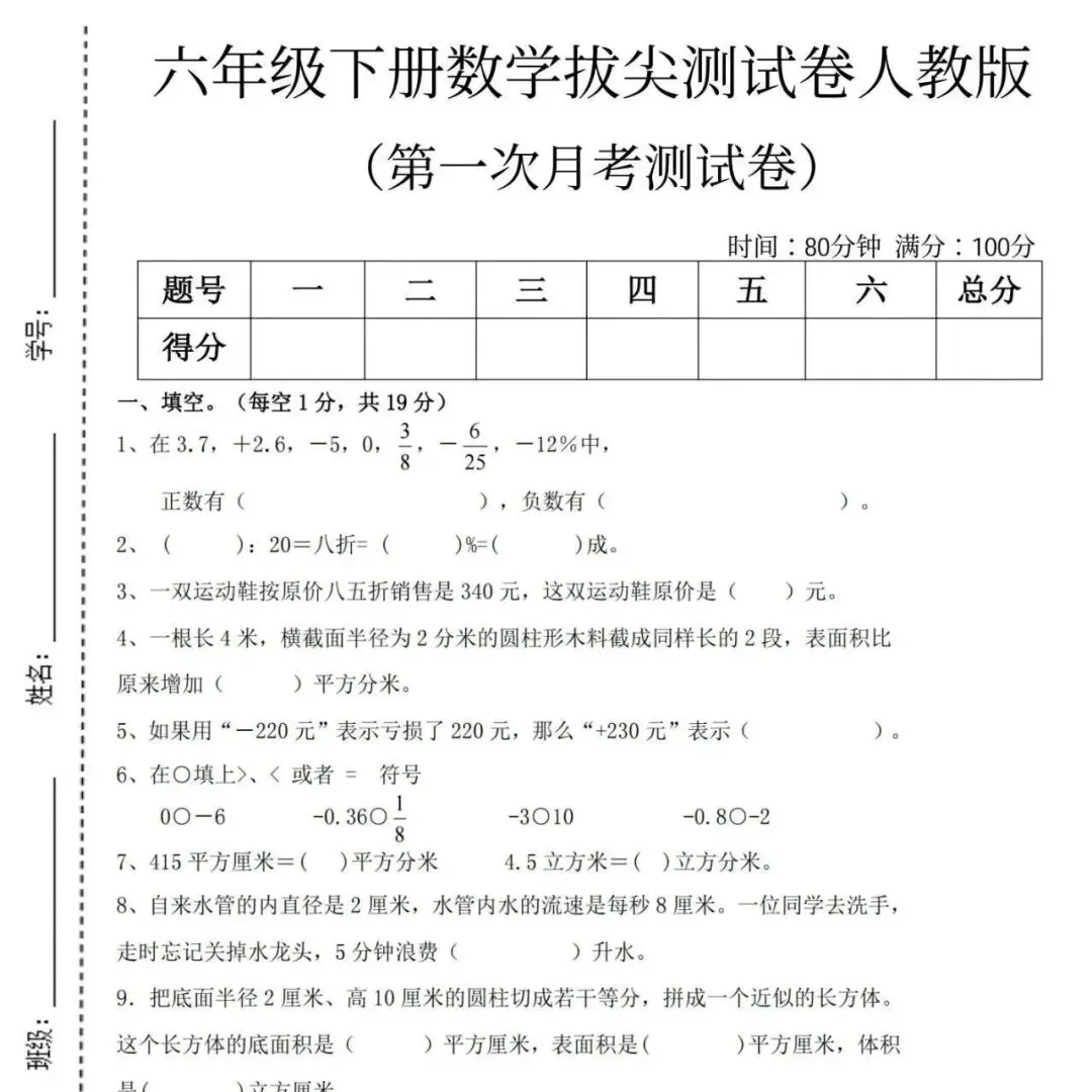 2026春六年级下册人教版数学《第一次月考检测试卷》(含答案)可打印