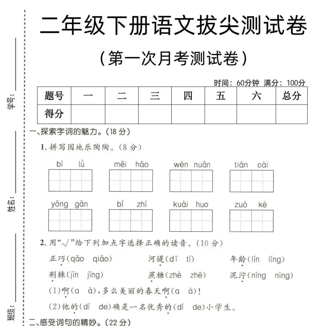 2026年春新版人教部编版二年级下册语文《第一次月考测试卷》,共2套,含答案,电子版可下载打印