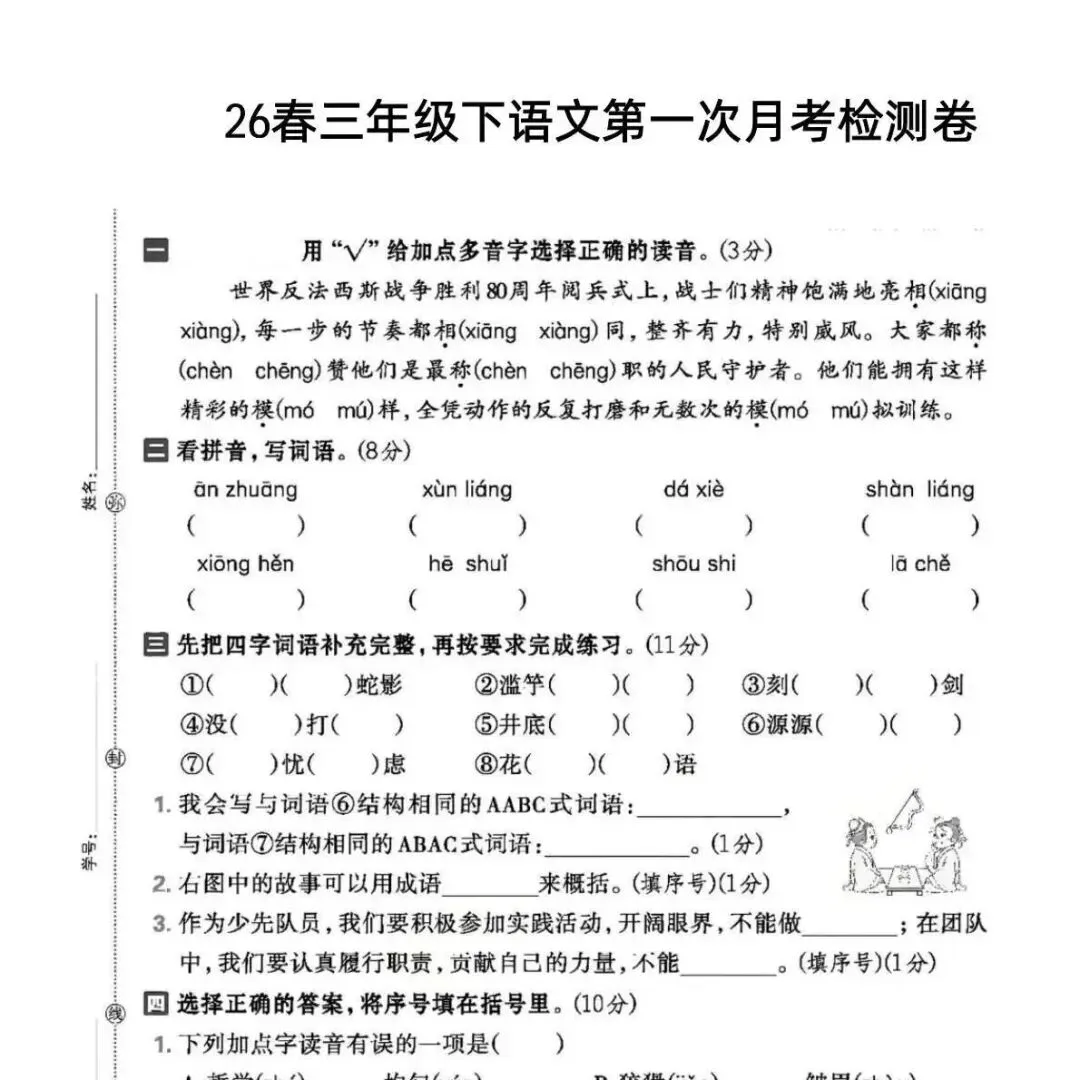 2026年春新版人教部编版三年级下册语文《第一次月考测试卷》共2套,含答案可下载打印