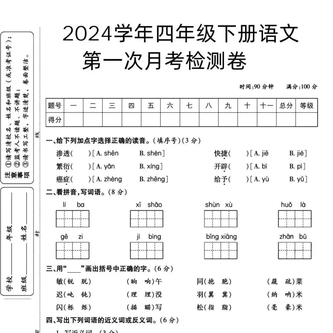 2026年春新版人教部编版四年级下册语文《第一次月考测试卷》,共3套,含答案,电子版可下载打印