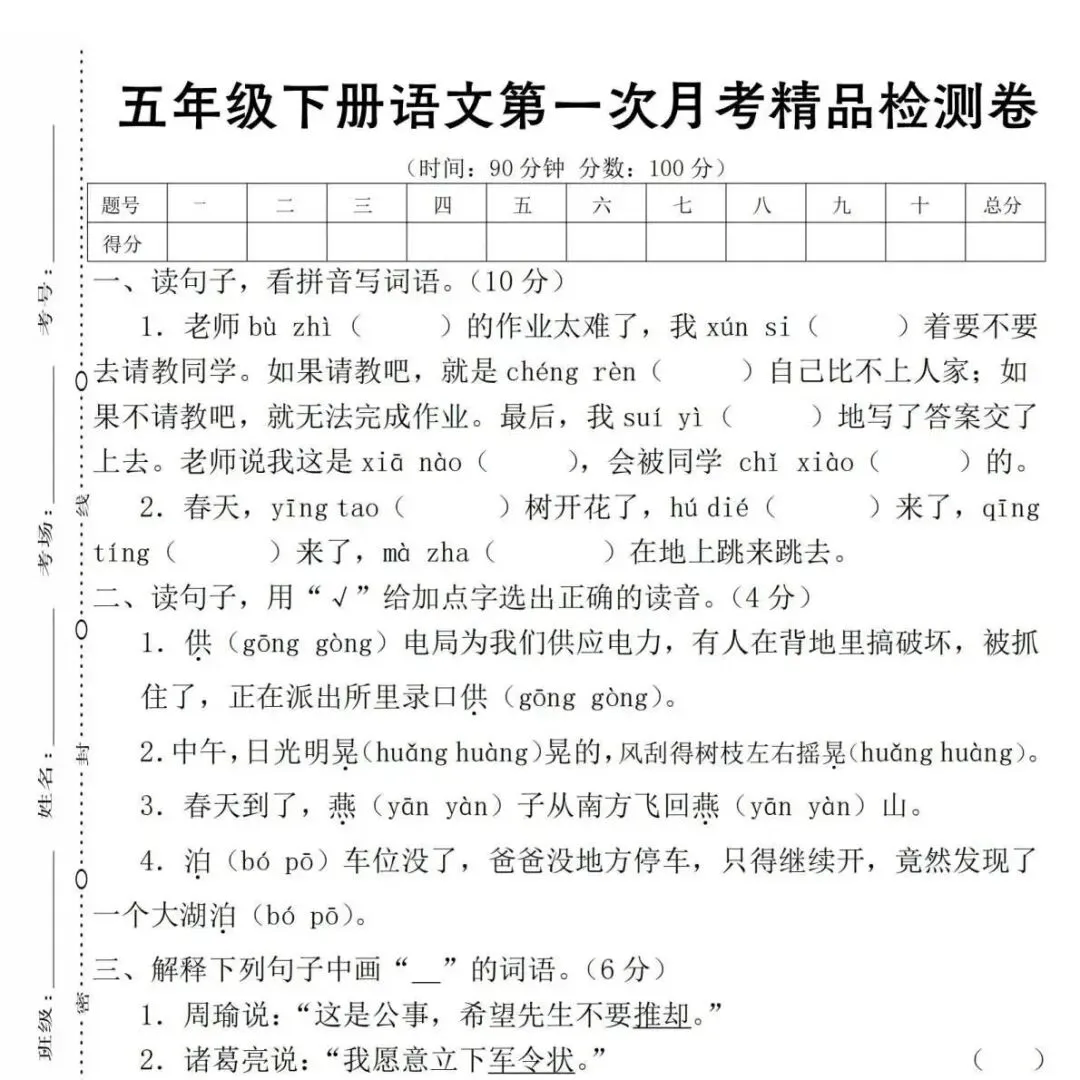 2026年春新版人教部编版五年级下册语文《第一次月考测试卷》,共3套含答案可打印
