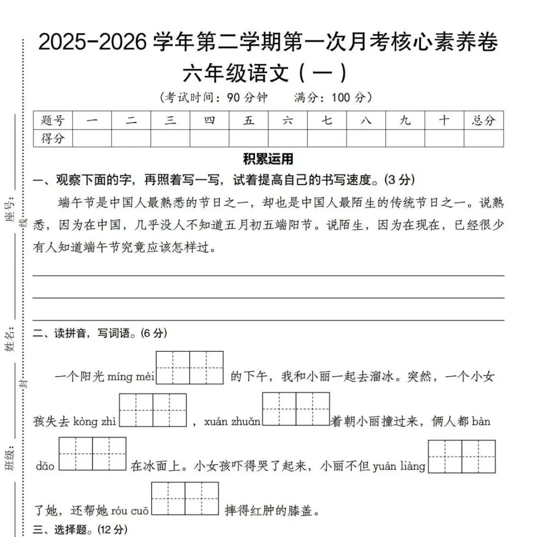 2026年春新版人教部编版六年级下册语文《第一次月考测试卷》,共3套含答案可打印