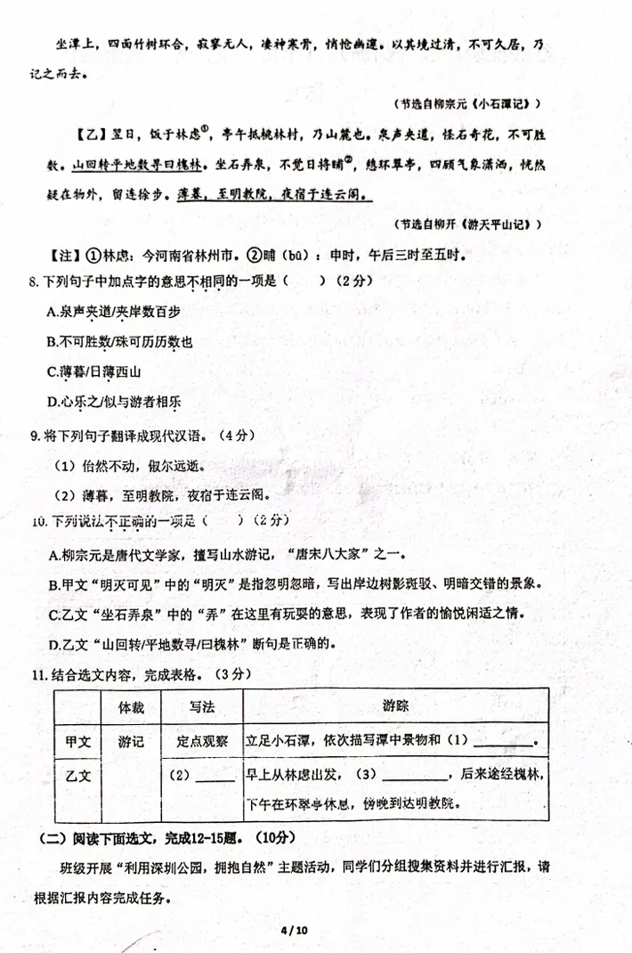 初中语文深圳八下初二下学期福田区语文试卷及答案