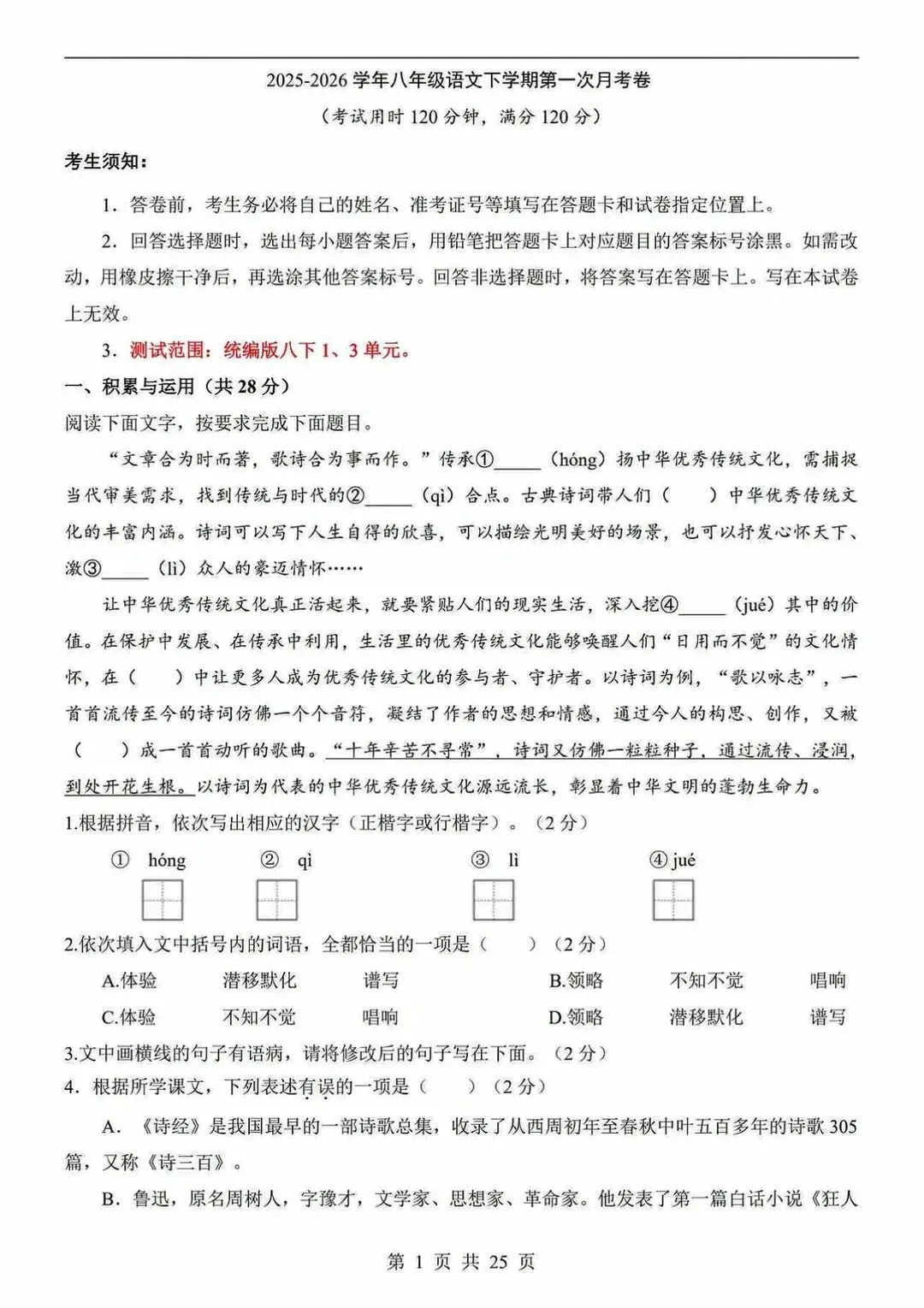 附有答案解析语文 月考 八下语文 第一次月考语文作文 初中语文 家长收藏孩子受益 语文笔记
